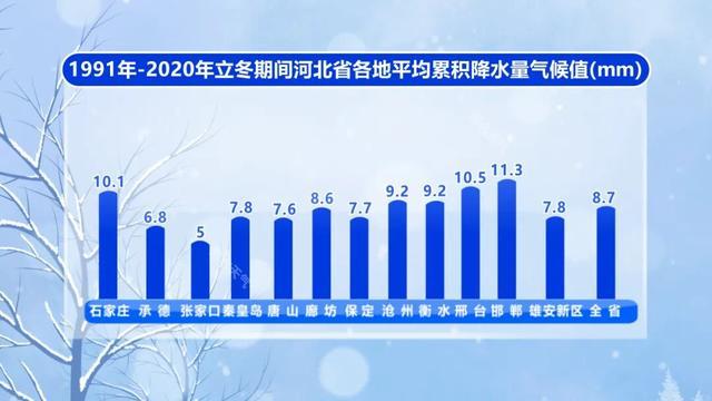 立冬时节,河北全省平均累积降水量为8.7mm,具体到各个地市,平均累积降水量较多的当属邯郸、邢台、石家庄,普遍都超过了10mm;其他地区则在5~9.2mm之间。