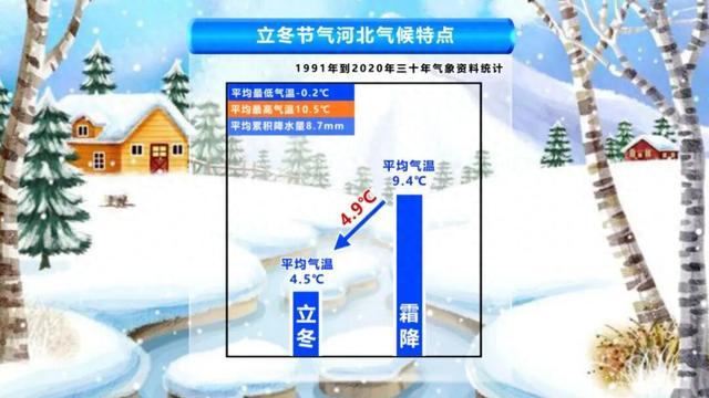 进入立冬节气,气温会下降更加明显,从1991年到2020年三十年气象资料来看,立冬时节,河北全省平均气温为4.5℃,较上个节气霜降的平均气温(9.4℃)下降了近5℃,平均最低气温-0.2℃,平均最高气温10.5℃。