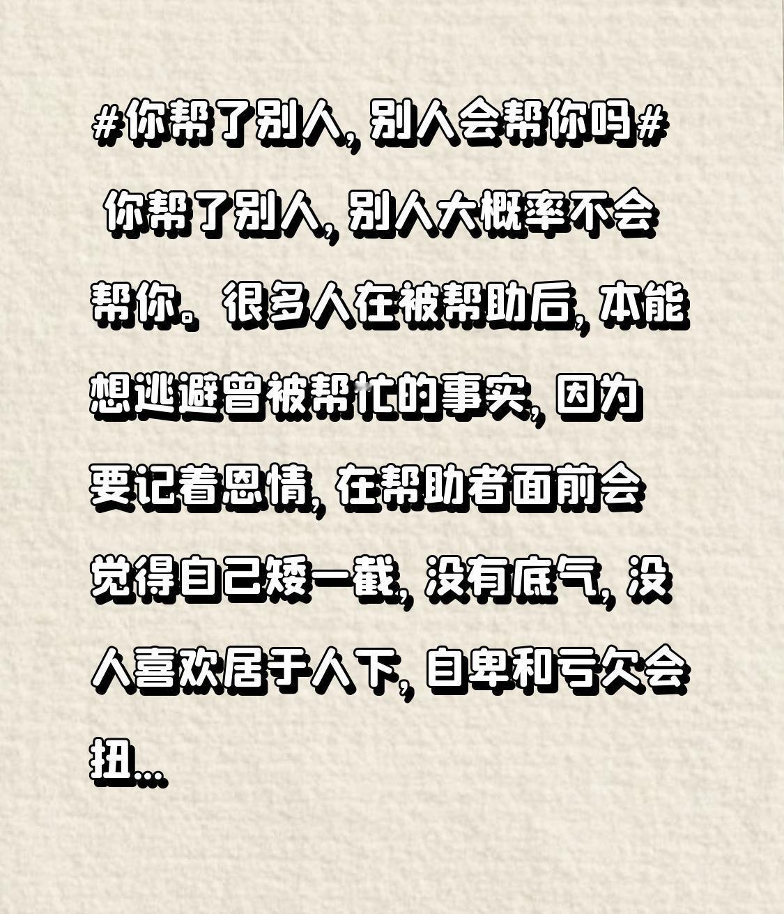 你帮了别人,别人大概率不会帮你。很多人在被帮助后,本能想逃避曾被帮忙的事实,因为要记着恩情,在帮助者面前会觉得自己矮一截,没有底气,没人喜欢居于人下,自卑和亏欠会扭曲心灵。 哈佛研究显示,65%的人三个月后对别人的帮助记忆衰减四成,不是他们冷血,是生活太忙。但腾讯两千个案例里,23%的人没忘,只是等一个触发点。有人二十年后找到资助自己上学的老师还钱。所以帮人时可以留些痕迹,别总觉得做好事不留名,不然可能就白帮啦。