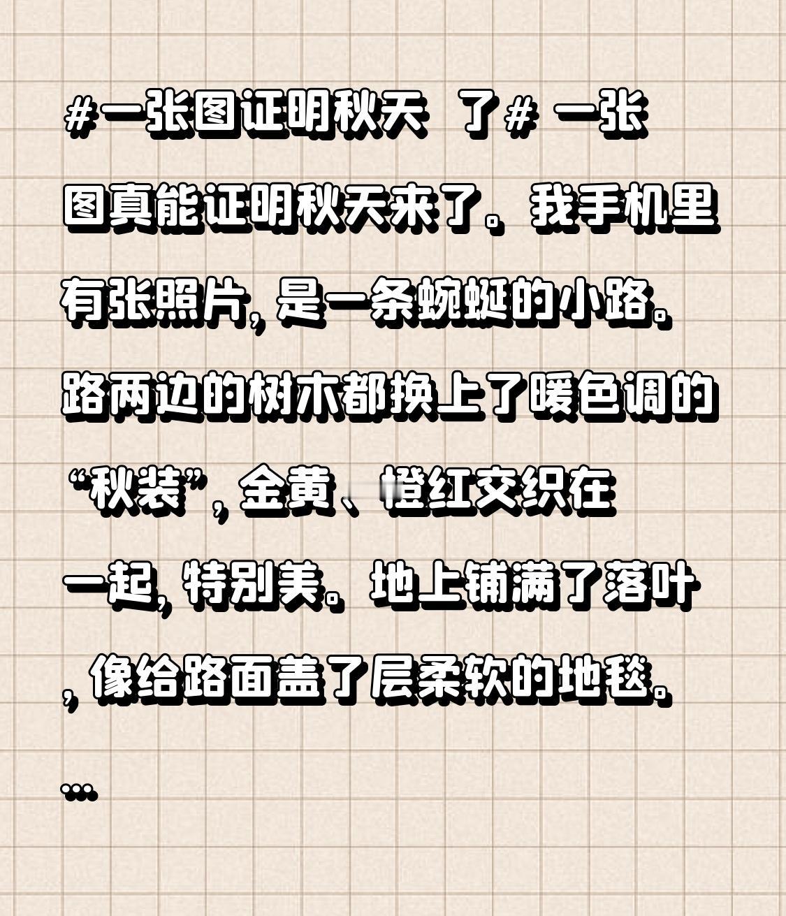 一张图真能证明秋天来了。我手机里有张照片,是一条蜿蜒的小路。路两边的树木都换上了暖色调的“秋装”,金黄、橙红交织在一起,特别美。 地上铺满了落叶,像给路面盖了层柔软的地毯。阳光从枝叶的缝隙中洒下来,形成一个个光斑,别提多有层次感了。 每次看到这张图,秋天的感觉就扑面而来。秋天不像夏天那么张扬,它总是悄悄来,用这些色彩和光影,诉说着独有的故事。