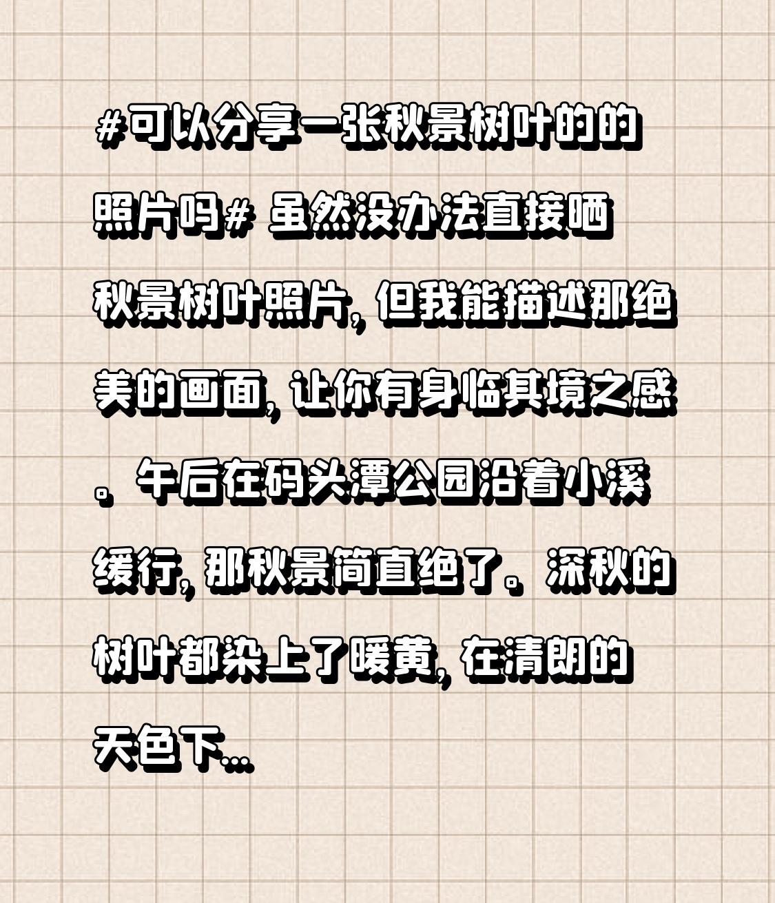 虽然没办法直接晒秋景树叶照片,但我能描述那绝美的画面,让你有身临其境之感。 午后在码头潭公园沿着小溪缓行,那秋景简直绝了。深秋的树叶都染上了暖黄,在清朗的天色下,就像被大自然精心调色过。每一片树叶都像是时光的书签,记录着金秋的美好。 还有住建部门前的银杏树,满树金黄,风一吹,金黄的叶子纷纷飘落,仿佛下了一场金色的雨。寒冬快到了,真盼着来一场雪,到时候雪中的树叶景致肯定别有一番风味。