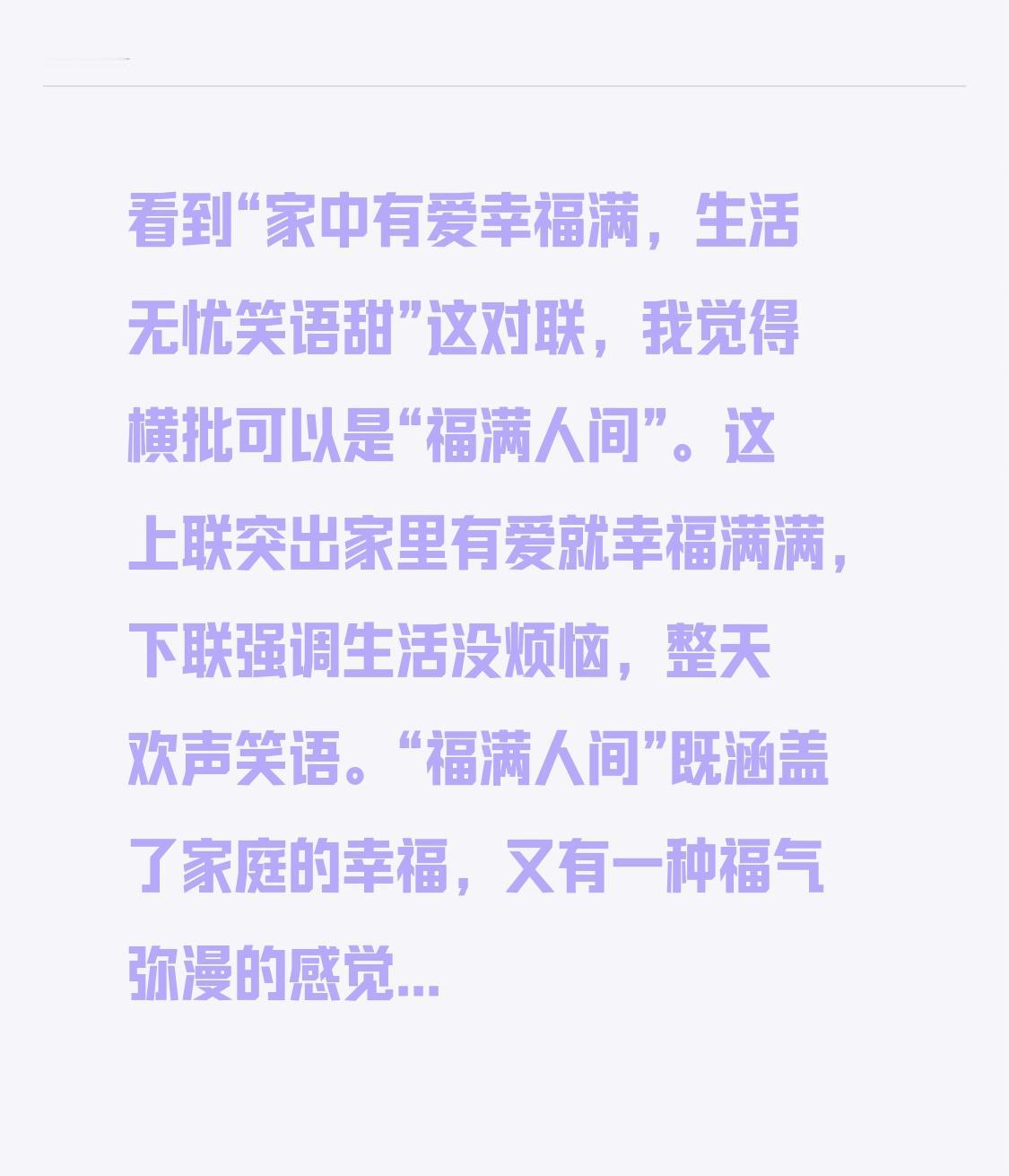 看到“家中有爱幸福满,生活无忧笑语甜”这对联,我觉得横批可以是“福满人间”。这上联突出家里有爱就幸福满满,下联强调生活没烦恼,整天欢声笑语。“福满人间”既涵盖了家庭的幸福,又有一种福气弥漫的感觉,和上下联的氛围很搭。就像那些家庭和谐幸福类的对联,横批往往都能精准概括上下联的美好寓意,“福满人间”也能很好地总结这副对联所表达的美满生活。