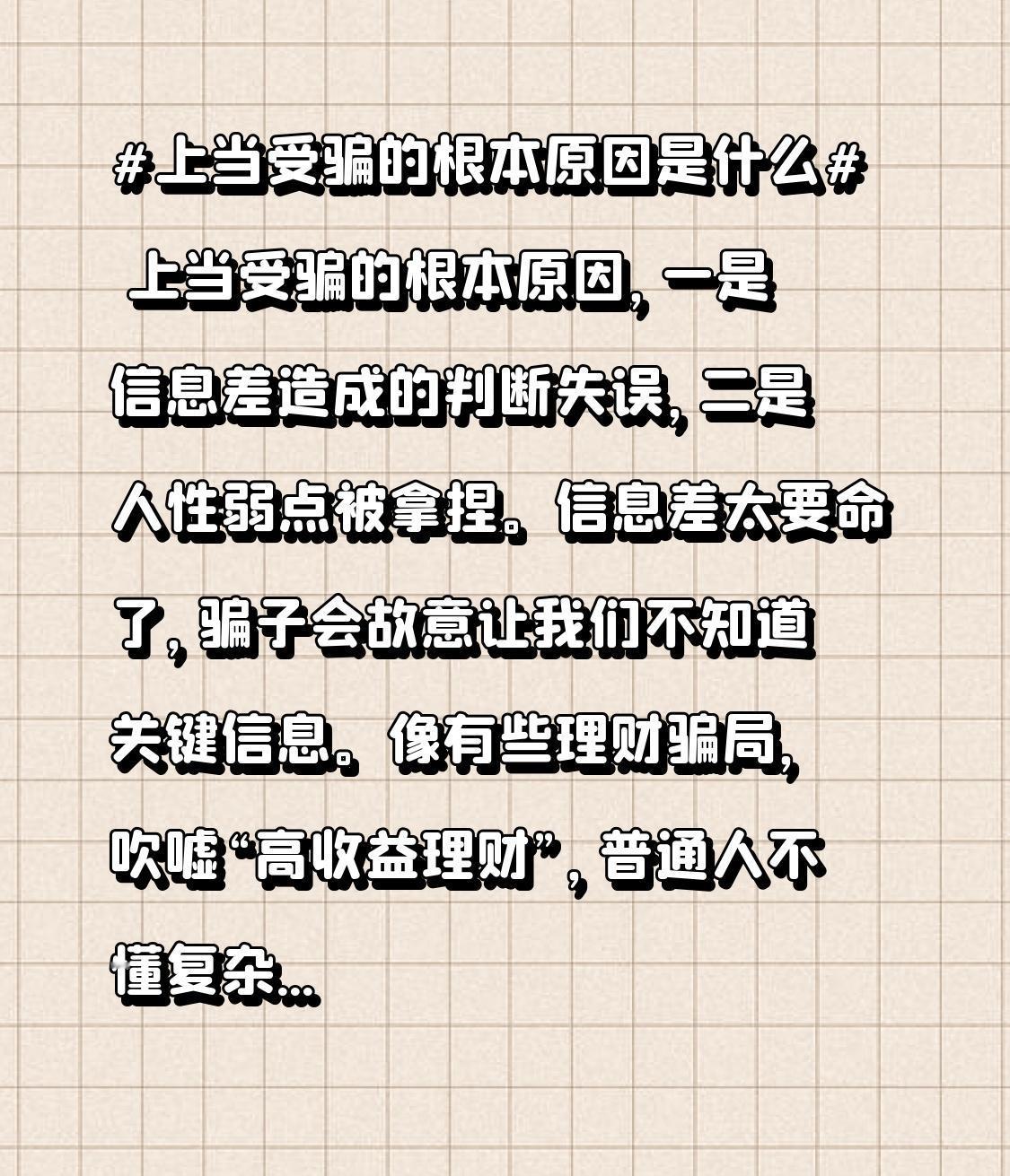 上当受骗的根本原因,其一为信息差导致的判断失误,其二是人性弱点被人拿捏。 信息差着实可怕,骗子会蓄意让我们对关键信息一无所知。例如某些理财骗局,鼓吹“高收益理财”,普通民众不了解复杂的金融知识以及背后潜藏的风险,就极易被蒙骗。 人性弱点更是问题的重灾区。贪图利益是许多人上当受骗的诱因,总幻想着不劳而获,结果被骗子描绘的美好愿景冲昏了头脑。恐惧和同情也常常被骗子利用,像“家人出事急需钱”这类诈骗,使人们在慌乱之中丧失理智。归根结底,我们还是要提高警惕,切勿让信息差和人性弱点给自己埋下隐患。