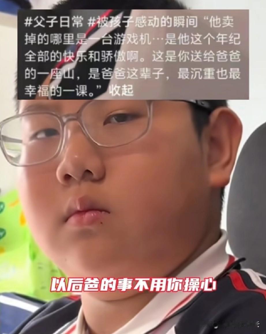 吉林,爸爸突然收到儿子的一大笔转账,爸爸很奇怪,他问儿子,你哪来的这么多钱,怎么都转给了我?然而儿子的回答感动了一大波网友。 儿子看着爸爸,很平静的说,我把我的游戏机卖了,所有的钱都转给了你。爸爸很不理解,为什么啊,你不是最喜欢游戏机吗?为啥偷摸就卖了? 儿子说,我看你前两天老打电话,咱家门口还贴着催款的单子。我寻思你遇到啥困难了,就想帮帮你。 儿子接着又说,我以后也不打游戏了,好好学习。 爸爸听了儿子的话很动容,他没想到,他在儿子心里这么重要。在儿子这个年龄,游戏机对他来说,意味着可是全部的快乐和骄傲啊。可是他为了父亲,就这么容易的舍弃了,这孩子多懂事啊。 不过爸爸还是对儿子说,我遇到困难,是我的事,我自己解决,以后你不用管这么多了。 爸爸也是希望儿子能开开心心的,不用那么懂事,保持他自己的快乐。 在听到儿子不再要回游戏机后,爸爸说游戏机的钱他给儿子保存着,他让儿子好好学习,别的事他来办。 儿子懂事的点了点头。 有网友说,这孩子真懂事,他卖游戏机相当于成年人买卖房。就能看出来孩子有多孝顺了! 我觉得,我们父母有时候真的不要太在意孩子有多优秀。知道感恩,知道父母的不容易的孩子就是好孩子。 对于这件事,你怎么看呢?