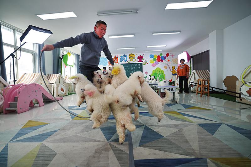 安徽萌宠剧文化发展有限公司负责人朱永明在进行小狗跳绳表演。