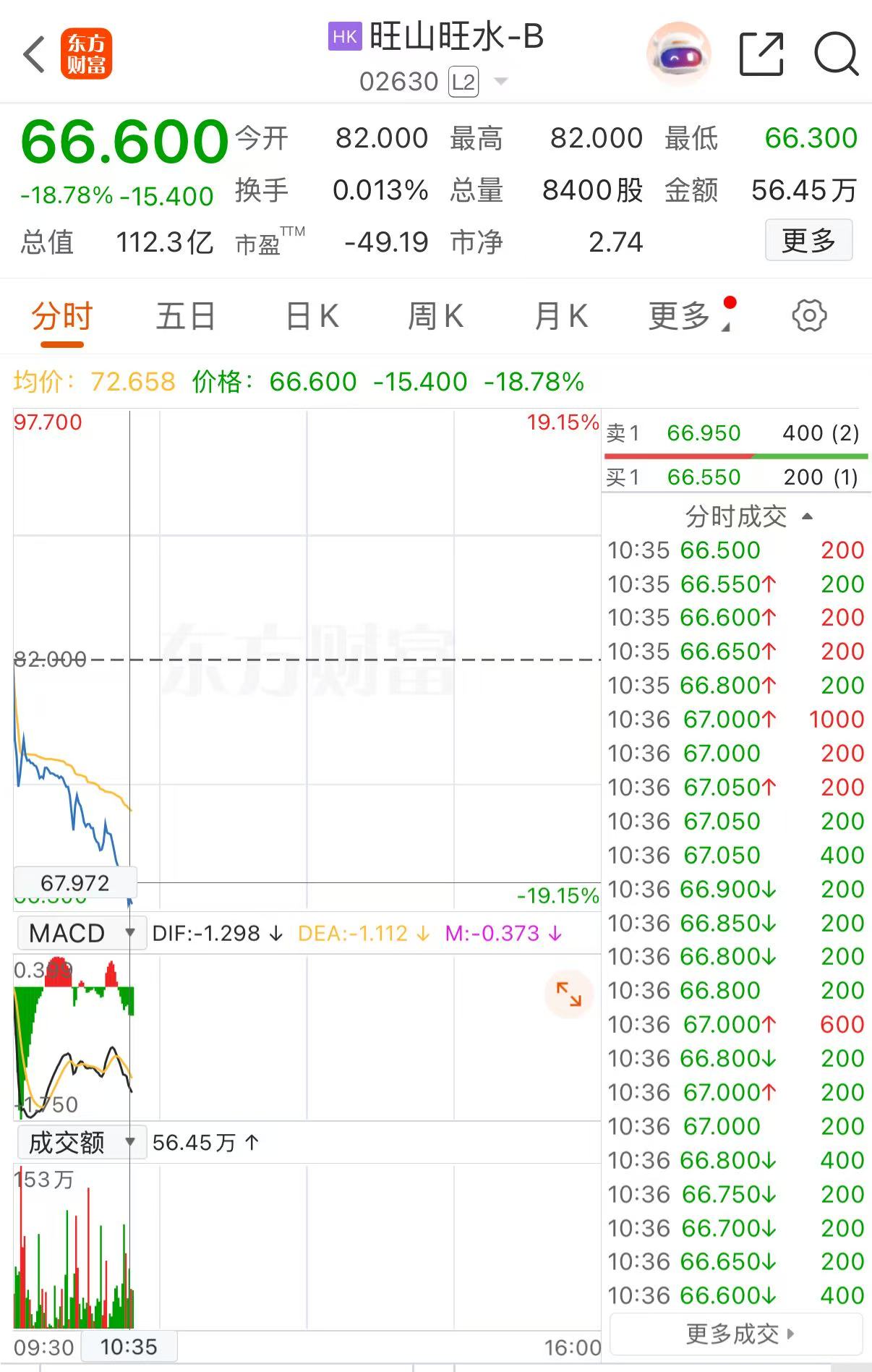上证报中国证券网讯(记者孔令仪)11月7日,旺山旺水开盘一度跌超19%,最低报66.3港元/股。截至10点35分,旺山旺水跌18.78%,报66.6港元/股,总市值约112.3亿港元。