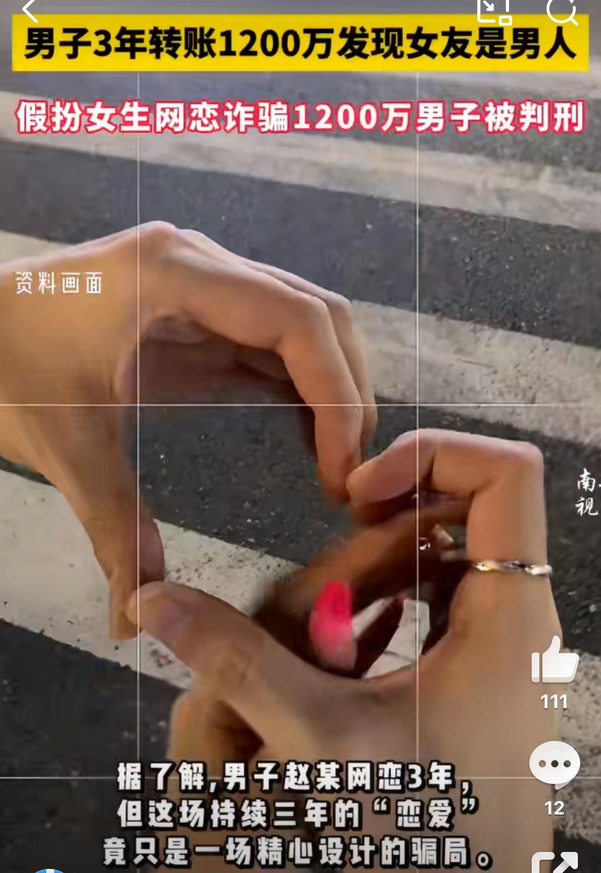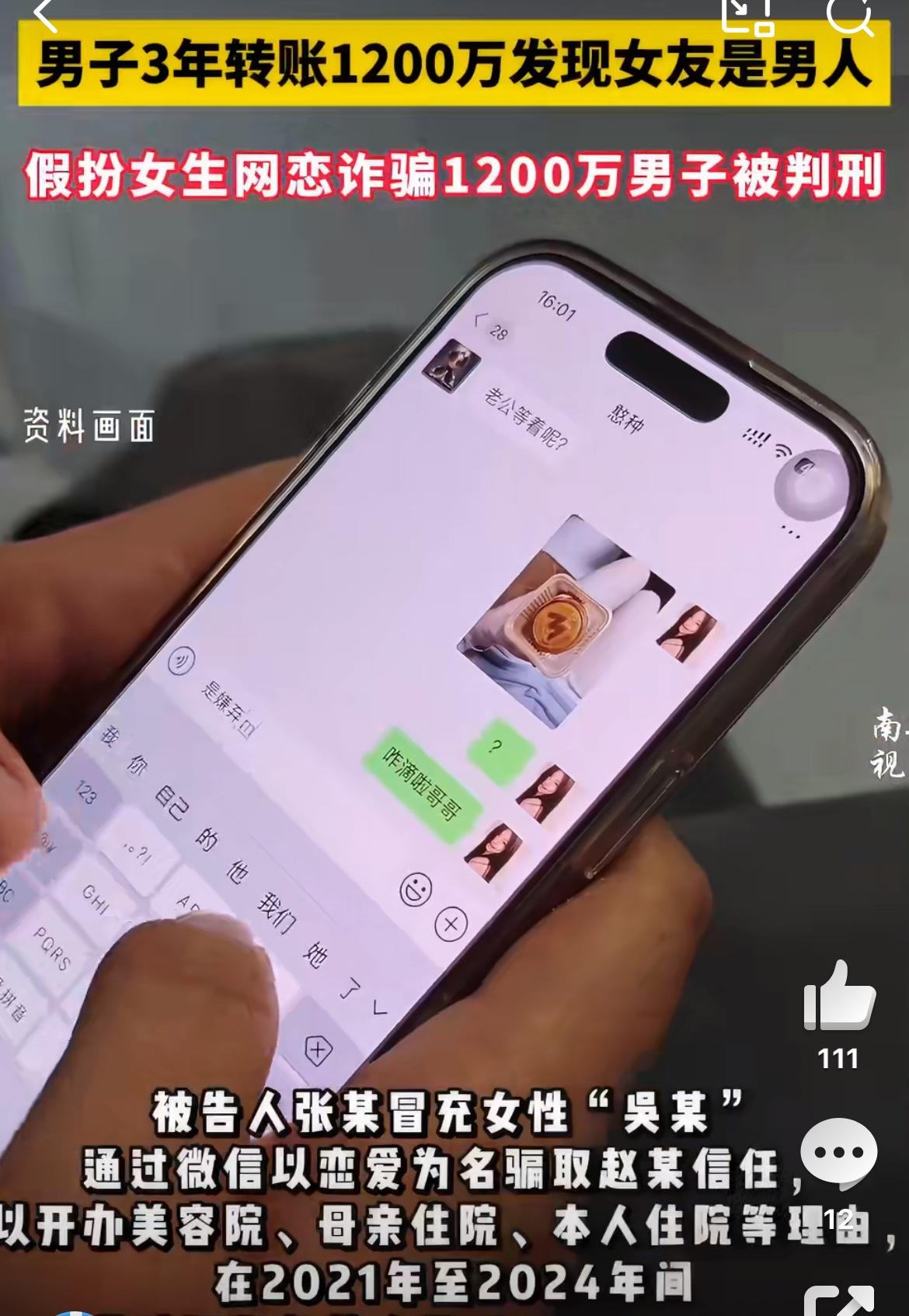 内蒙古男子网恋三年给女友转账1200万,见面发现是男人,直接崩溃。一个姓吴的女子加了男子的微信,两人聊的火热,很快成为男女朋友关系,女滴接下来就开始用各种理由让男子借钱给她,什么家人生病,自己要创业,要去旅游,要买车,男子言听计从。不懂男子的脑回路,有这么多钱,什么样的女生找不到呢?并且还是个男人扮的女人。中老年网恋骗局 网恋诈骗