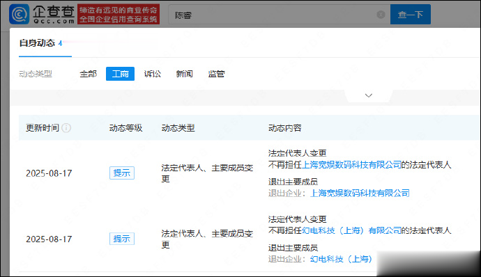 此前,陈睿已卸任上海宽娱数码科技有限公司、幻电科技(上海)有限公司法定代表人、执行董事职务。