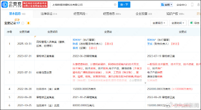 8月18日,蓝鲸新闻从企查查App显示,近日,B站关联公司上海宽娱数码科技有限公司、幻电科技(上海)有限公司发生工商变更,陈睿卸任两公司法定代表人、执行董事职务,由黄声声接任。