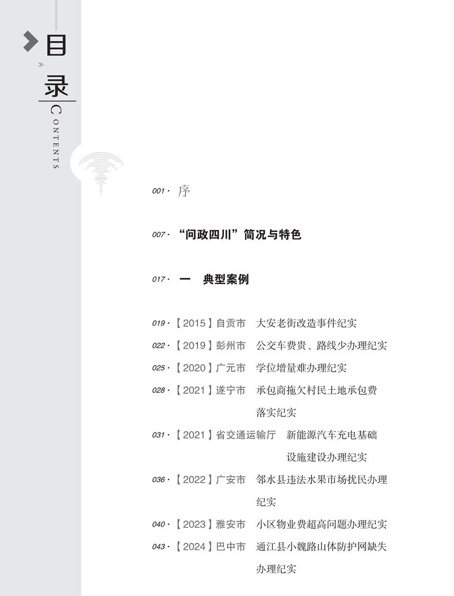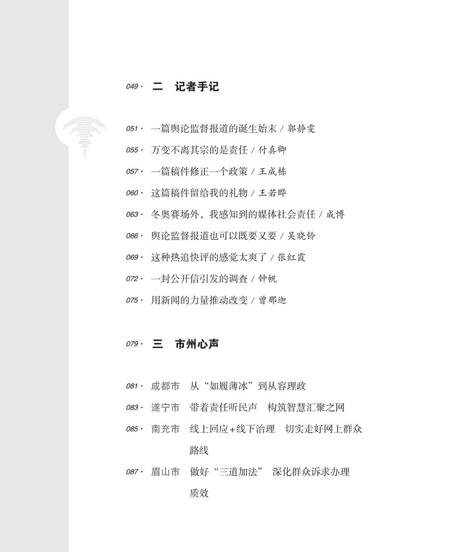 由此,《看见你》聚焦“问政四川”十年经验,联动业界、政界、学界,以案例选编、记者札记、专业解析相结合的方式,探解走好群众路线的协作之道,而不囿于狭义的媒体治理或电子政务。具体而言,全书精选“问政四川”平台上的8个典型案例,涵盖公共安全、市政建设、教育学位等多个民生领域,以及9篇记者手记,10篇省内市州十地网信办、相关机构的参与心得和4篇学术论文,立体呈现了媒体、政府与公众在“问政—理政—共治”过程中的互动与成长。