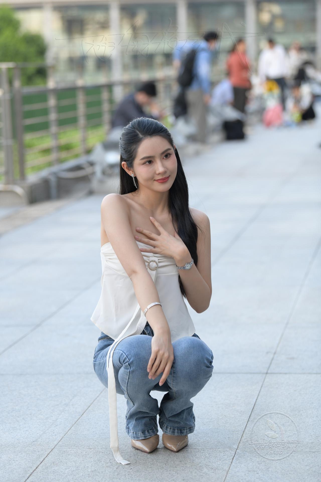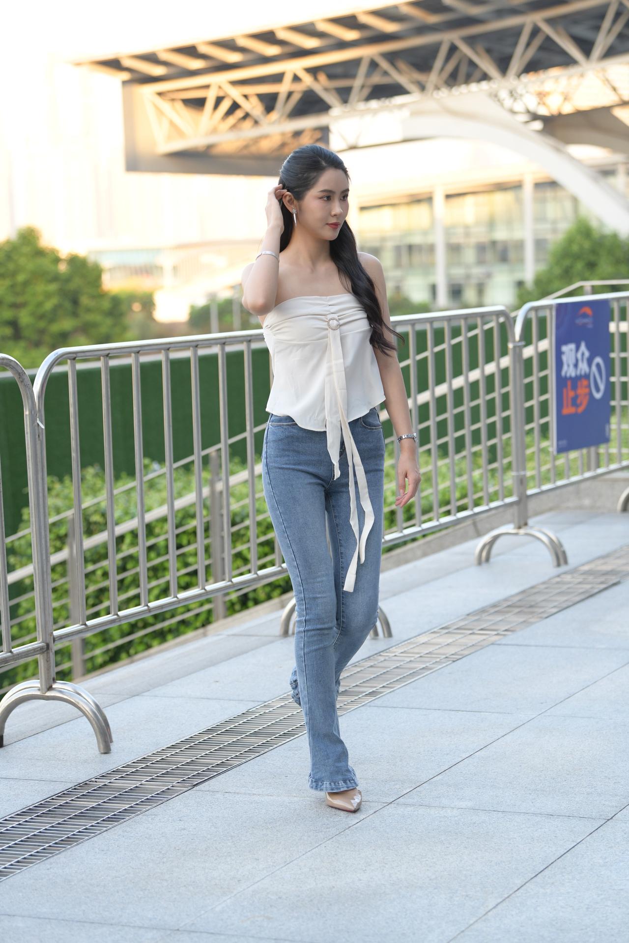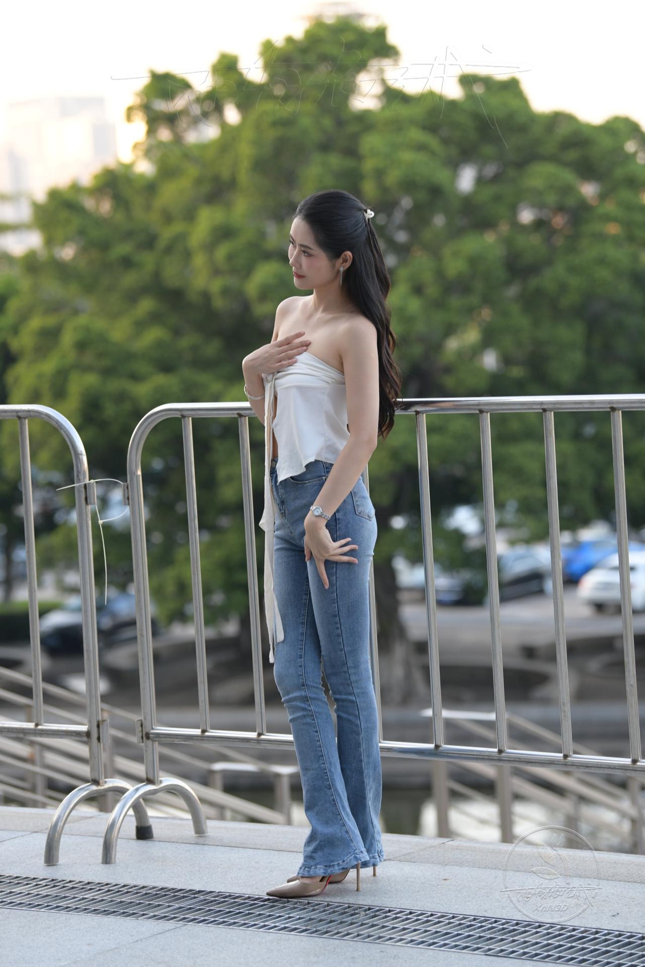 白色抹胸紧身牛仔裤小姐姐,凸显高挑和靓丽 8527来自小姐姐的美,也是城市的风景线 素材来自网络