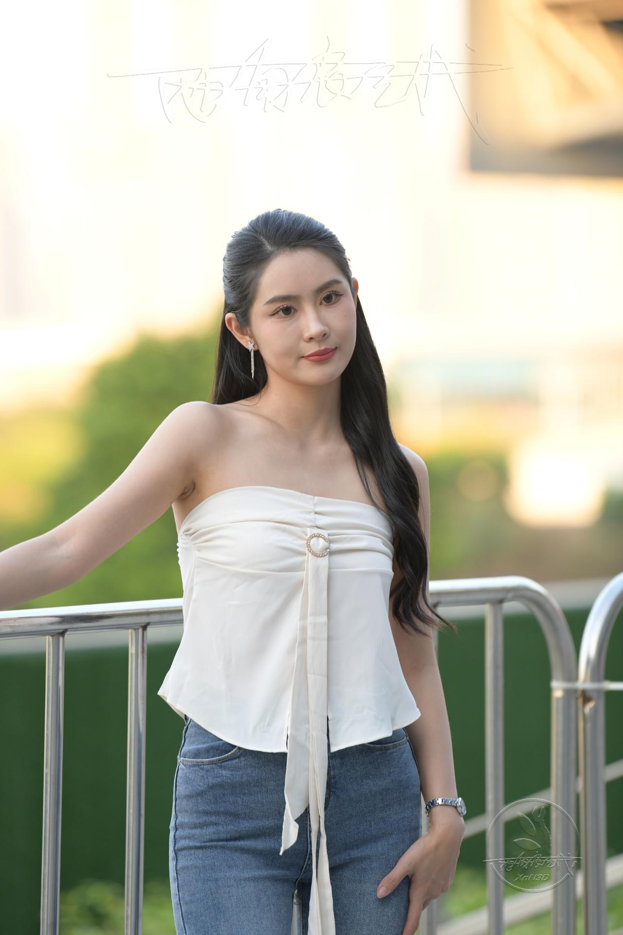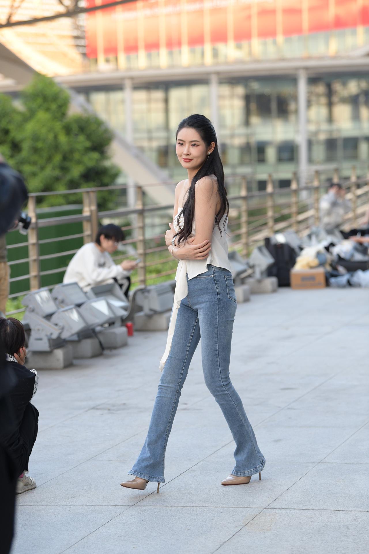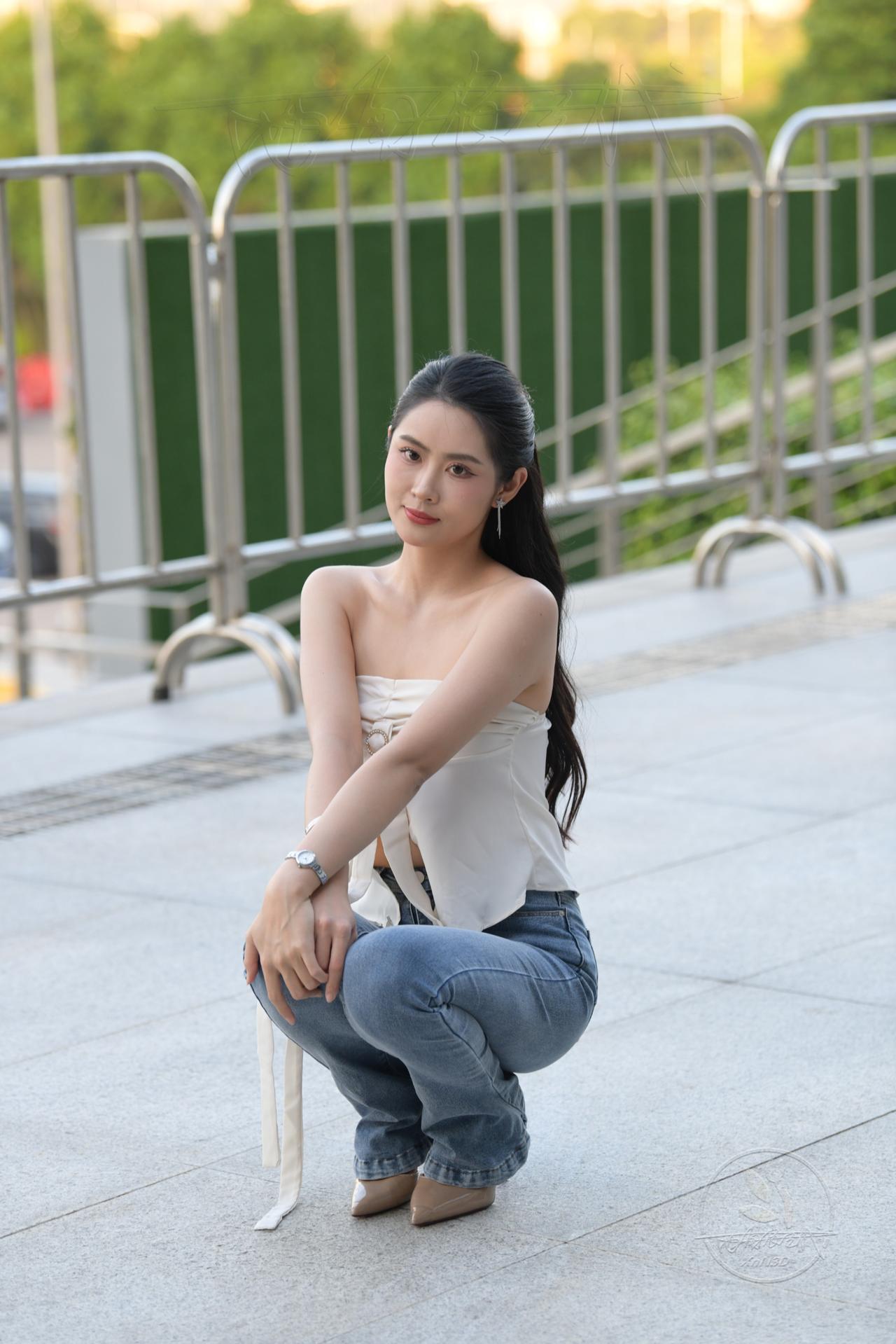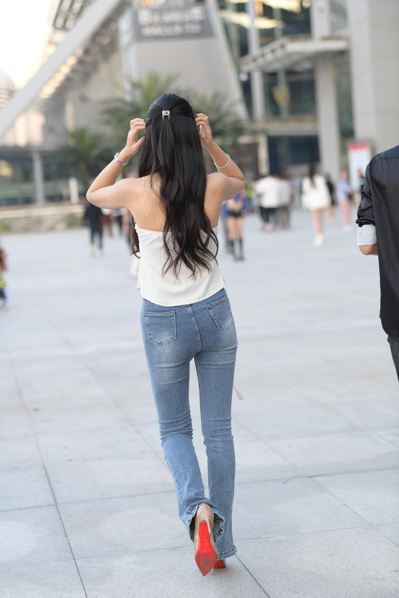 白色抹胸紧身牛仔裤小姐姐,凸显高挑和靓丽 8527来自小姐姐的美,也是城市的风景线 素材来自网络