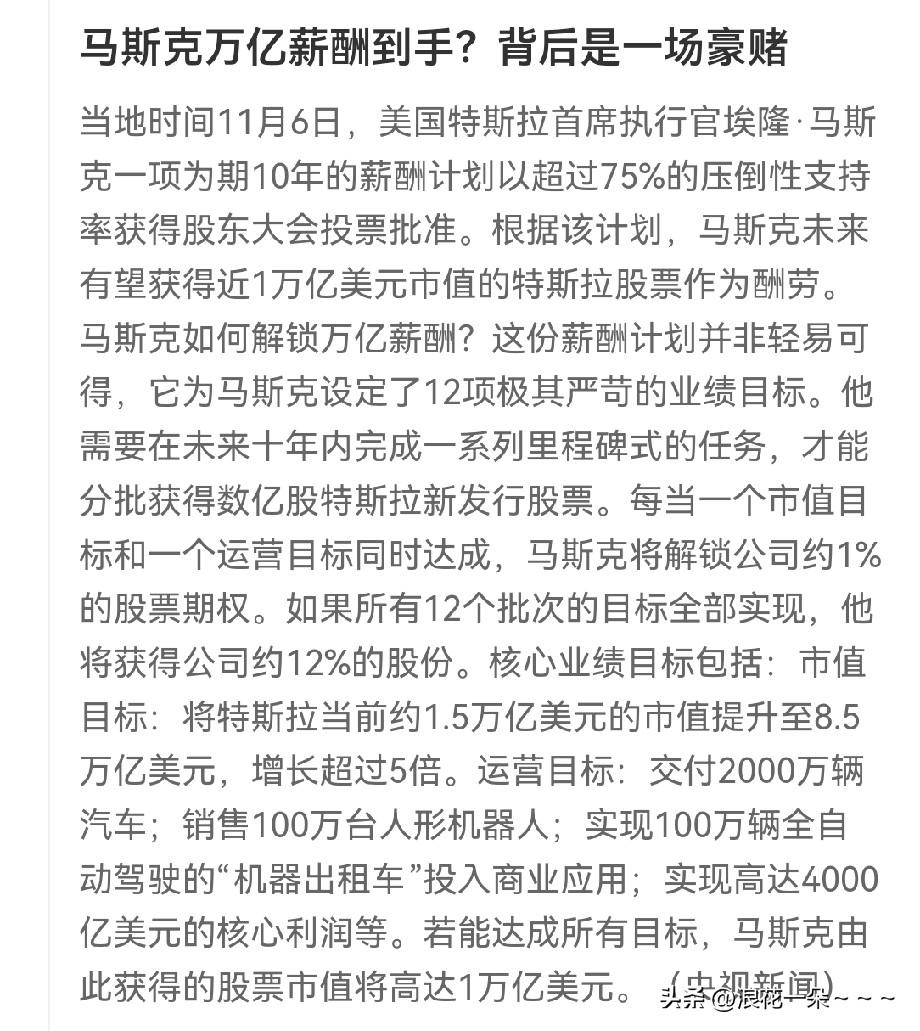 太辣眼睛了!我的个娘哎! 看看图一马斯克未来的10年计划,咱还能睡得着觉吗?他要实现100万台人形机器人和100万辆“机器出租车”的目标… 其他关于他的什么薪酬啊,销售多少车辆咱就不说了。 仔细想想,光这100万台人形机器人得代替多少人工作啊? 照这样下去,以后再不努力,饭碗可能都没了,因为真有可能岗位被马斯克的机器人抢走了,难道以后赚不到钱买特斯拉汽车,一出门就躺在马斯克的无人出租车里睡大觉吗?[捂脸] 1万亿元的薪酬?马斯克赌的是他的薪酬,但,赌的是我们的未来啊!