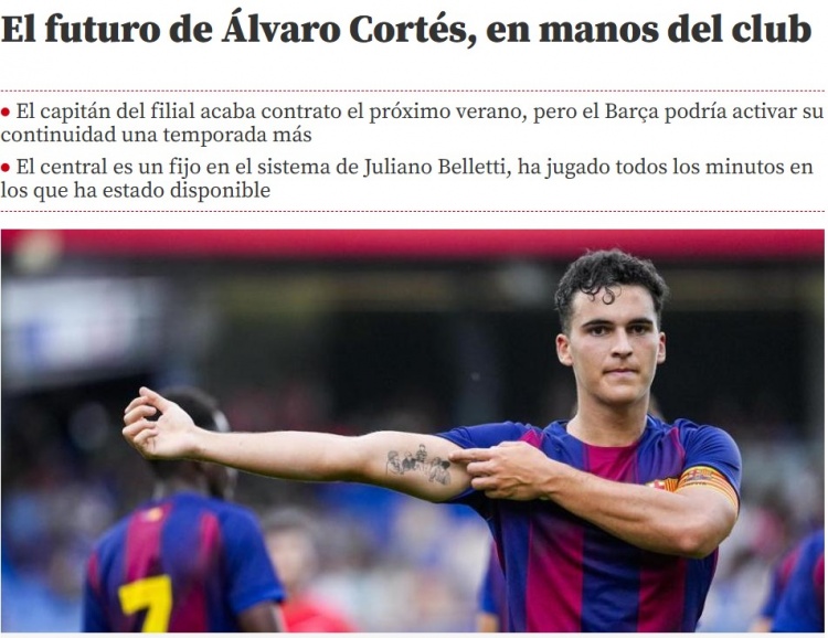 直播吧11月7日讯《世界体育报》报道,巴黎圣日耳曼有意巴萨B队队长阿尔瓦罗-科尔特斯,他的合同将在明年到期。