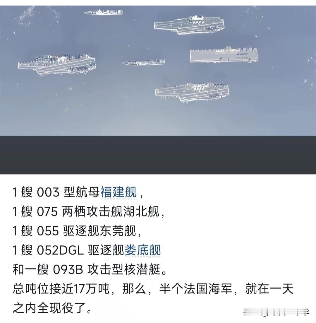 厉害了我的国,在同一天入列了几乎一整支航母编队,总吨位近17万吨,赶上半个法国海军了,曾经的海上列强,已成为我们海军的衡量单位。福建舰正式入列,我国迎来三航母时代。