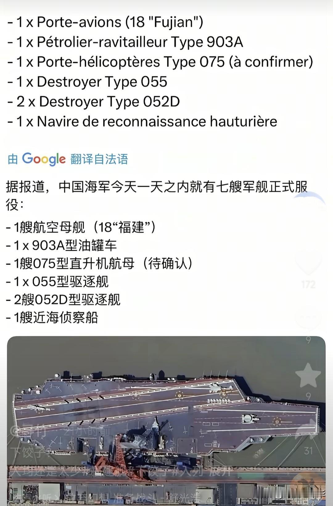 厉害了我的国,在同一天入列了几乎一整支航母编队,总吨位近17万吨,赶上半个法国海