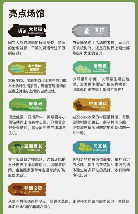 🎫南门→⭐南门新区(非洲村落→迷你沙丘→智慧之灵→伟大的猿→穿越大草原→犀牛领地→澳洲袋鼠角→马岛客厅→狐猴漫步)→⭐放牛山(考拉馆→亚洲灵长区→河马馆→冈瓦纳区→象馆→高黎贡区)→⭐大红山(虎馆→猕猴世界→细尾獴→本土保育区→狼馆→猫科星球→熊馆)→⭐小红山(热带鸟馆→唐家河→北门湖)→大熊猫馆→🎫北门