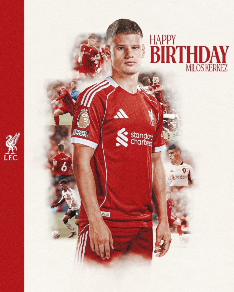 利物浦官方社媒晒出为凯尔凯兹制作的生日海报,配文:“祝你度过美好的一天,米洛斯。”