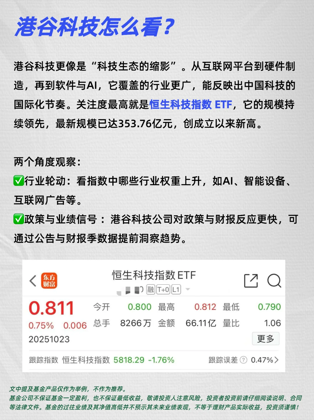港谷的恒生科技指数ETF覆盖更广,既有互联网平台,也有AI软件和智能设备。它反映的,是中国科技从“制造创新”走向“生态创新”的过程。白天A股看产业逻辑,港谷就能补上国际视角。