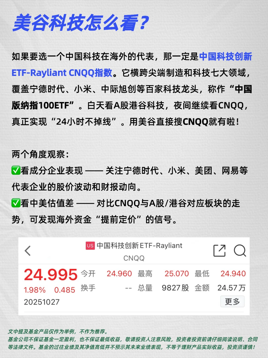 夜盘时段,美谷的中国科技创新ETF——Rayliant CNQQ登场。它在纳斯达克交易,汇集近百家中国科技企业,是观察海外资金如何定价中国创新力的窗口。假期、夜间都能追踪,不用担心错过行情。用美谷直接搜“CNQQ”就能找到。