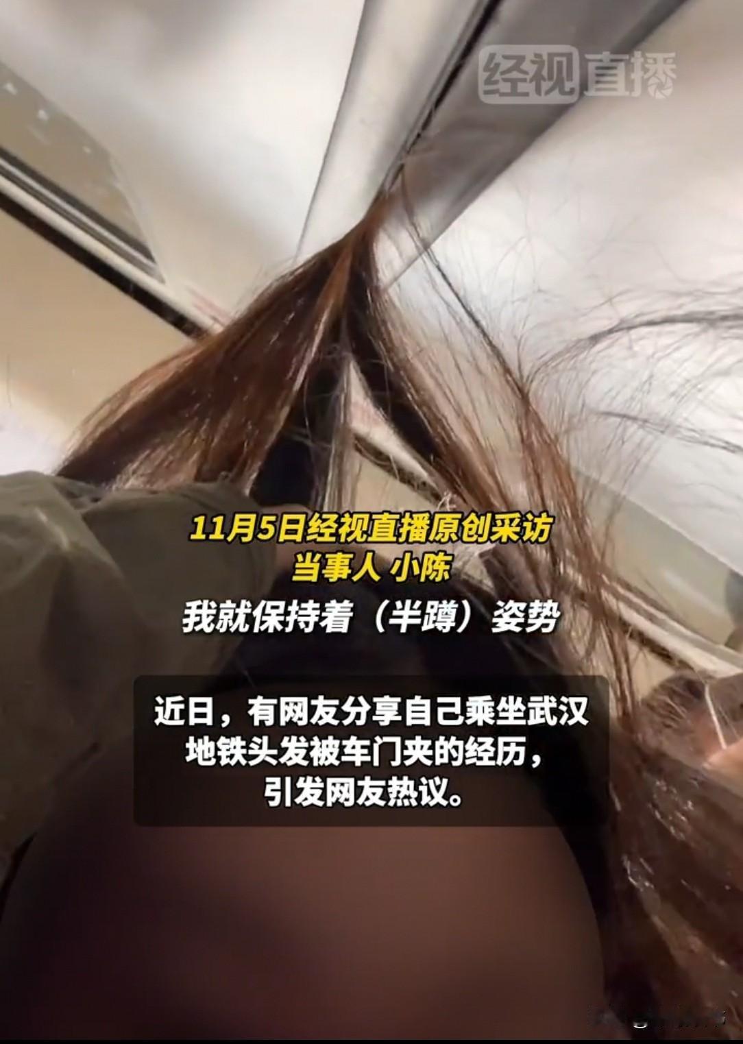武汉一地铁车厢里,一女子弯腰捡东西,车门突然关上,夹住了她的头发。她使劲拽,怎么也拽不出来,心里发慌,只好一直半蹲着。 女子姓陈,是一名普通的上班族。 这天早高峰,小陈像往常一样带着早餐乘坐地铁去上班 。 一开始车厢还松快些,可到了换乘站,涌进来的人瞬间把她挤到了车门边,后背紧紧贴着冰冷的车门,连转身都难。 突然,身后有人猛地撞了她一下,“不好意思不好意思!人太多了!”一道急促的道歉声传来,小陈还没来得及回头说“没事”,手里的早餐袋就掉在了地上。 “糟了!”女子心里一紧,顾不上多想,赶紧弯腰去捡,长发随着动作垂落,扫过车门缝隙。 她指尖刚碰到塑料袋,就听见“嘀嘀”的关门提示音,可身后的人还在往前挤,她根本没法立刻直起身。 下一秒,“咔嗒”一声,车门合上了,恰巧小陈也要起身。 “嘶——”她倒抽一口冷气,只觉得头皮一阵尖锐的刺痛。 她摸了摸头,立马意识到自己的头发,被车门夹在了缝里。 她慌忙伸手去拽,手指抠着车门缝隙,使劲往外拉头发,可车门关得严丝合缝,头发像被焊在了里面似的,纹丝不动,反而越拽越疼,眼泪瞬间涌了上来。 “怎么办?怎么拽不出来?”小陈的声音发颤,眼神慌乱地看向周围,身边的乘客也注意到了她的窘境,有人小声说“别硬拽啊,越拽越紧”,还有人试着帮她掰车门,却也无济于事。 恐慌像潮水似的裹住了小陈,她盯着紧闭的车门,脑子里全是不好的念头:“要是车门一直关着,头发会不会被扯断?万一地铁运行中出点事怎么办?” 她试着直起身,可头皮的刺痛立刻加剧,疼得她浑身发僵。 就在这时,地铁缓缓启动,车身轻微晃动,小陈只好赶紧维持着弯腰半蹲的姿势,双腿微微发抖,手心全是冷汗,连呼吸都不敢太用力。 “再坚持一下,下一站很快就到了。”她在心里给自己打气,目光死死盯着车厢里的站点提示,每一秒都过得格外漫长。 好在地铁速度快,没过几分钟,就到了下一站。 当车门“哗啦”一声再次打开时,小陈几乎是立刻就感觉到头皮一松。 她赶紧小心翼翼地把头发抽出来,看着那撮被夹得有些凌乱的头发,悬着的心才终于落了地,腿一软,差点没站稳。 其实小陈的办法很冒险,万幸这次没出意外,可万一车门出现故障,或是头发被夹得更深,后果不堪设想。 如若我们遇到这种情况,一定要第一时间按车厢里的紧急呼救按钮,或是拨打地铁服务热线,找工作人员帮忙处置,千万别像小陈这样硬扛,安全永远是第一位的。