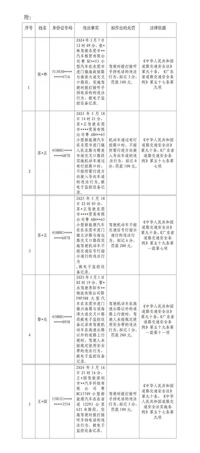 以下四名驾驶人,因道路交通违法行为被电子监控设备记录,当事人未在限定期限内接受处理。根据《中华人民共和国行政处罚法》第四十四条、《公安机关办理行政案件程序规定》第一百六十八条等规定,现将其对应违法事实、理由和处罚依据公告告知如下,根据《中华人民共和国行政处罚法》第四十五条的规定,当事人有提出陈述和申辩的权利。如要提出陈述和申辩,请自公告之日起七日内向东莞市公安局交通管理支队虎门大队(地址:东莞市虎门镇长德路22号,联系人:谢警官、郑警官,联系电话:0769-85104773)提出,逾期不提出的视为放弃陈述和申辩。