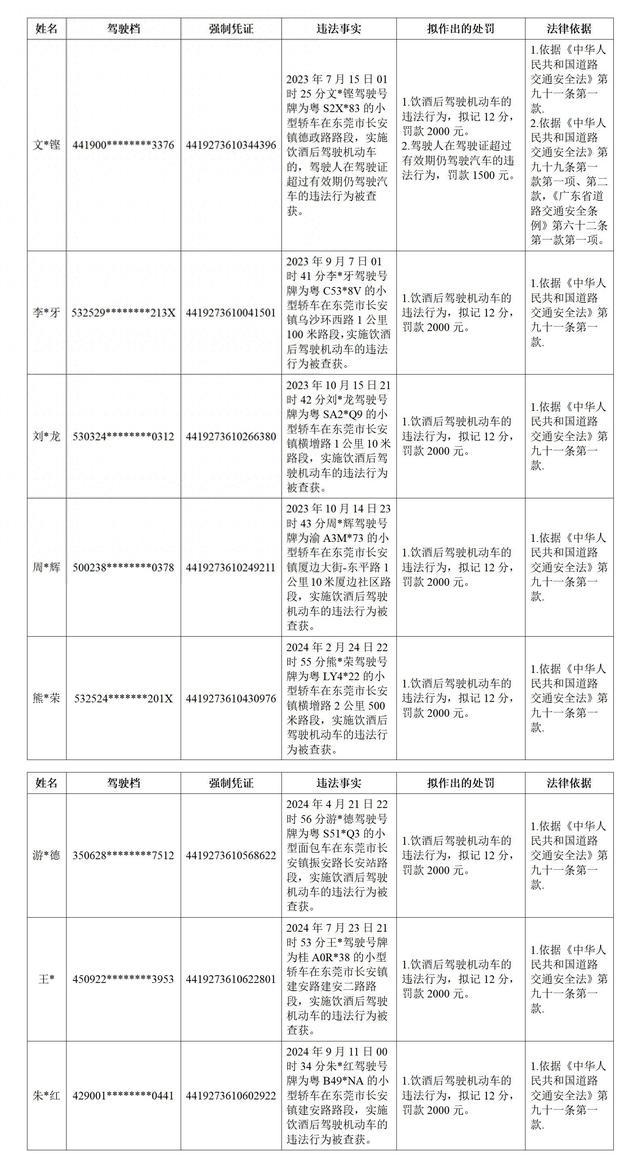 以下8名机动车驾驶人,因道路交通违法行为被东莞市公安局交通管理支队长安大队查获,当事人未在限定期限内接受处理。根据《中华人民共和国行政处罚法》第四十四条、《公安机关办理行政案件程序规定》第一百六十八条等规定,现将其对应违法事实、理由和处罚依据公告告知如下,根据《中华人民共和国行政处罚法》第四十五条和六十三条的规定,当事人有提出陈述与申辩以及要求听证(吊销机动车驾驶证、单项违法行为罚款金额2000元以上)的权利。