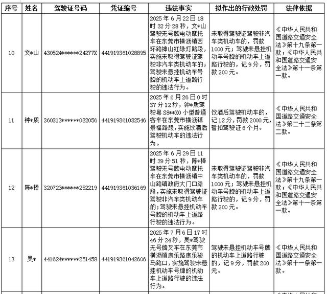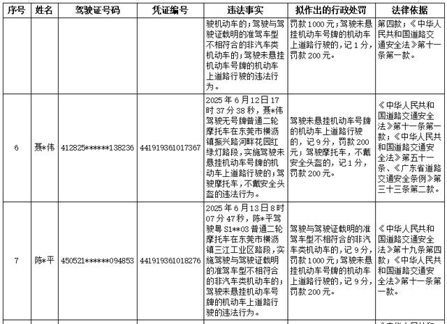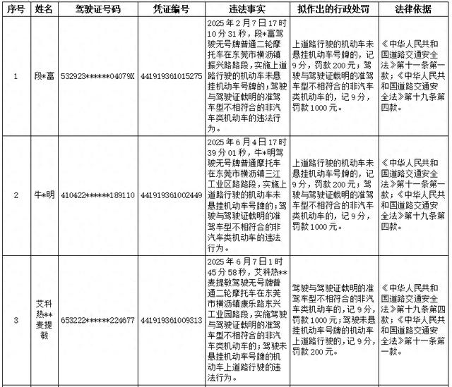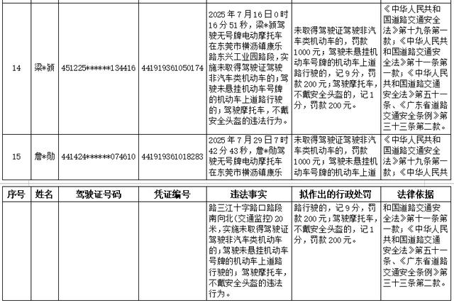 以下15名机动车驾驶人,因道路交通安全违法行为被东莞市公安局交通管理支队横沥大队查获,当事人未在法定期限内接受处理。根据《中华人民共和国行政处罚法》第四十四条、《公安机关办理行政案件程序规定》第一百六十八条等规定,现对其违法事实、理由和处罚依据公告告知如下,根据《中华人民共和国行政处罚法》第四十五条和六十三条的规定,当事人有提出陈述和申辩以及要求举行听证(吊销机动车驾驶证、个人处以2000元及以上罚款)的权利。如提出陈述和申辩的,请自公告之日起七日内向东莞市公安局交通管理支队横沥大队(东莞市横沥镇北环路261号)提出;如要求听证的,请自公告之日起五日内向东莞市公安局交通管理支队执法监督大队(地址:东莞市莞龙大道下桥路段268号)提出,逾期不提出的,视为放弃陈述和申辩、放弃听证。(清单附后)。