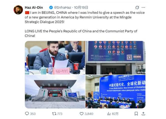 美国共产党执行主席哈兹·阿尔丁首次访华,实地考察中国后,狂赞中国:“中华人民共和国万岁!中国共产党万岁!”“中国的现代化不是照搬西方模式,强大国家的崛起也能成为全球稳定的力量”。   要知道,这是阿尔丁这辈子头回踏上中国的土地,2025年10月17日刚落地北京,他的行程安排得比闹钟还准时,明摆着是揣着一肚子好奇来寻答案的。   10月18日一大早,阿尔丁没去逛什么景点,直接扎进了中国人民大学。这儿正办着“明德战略对话2025”,是重阳金融研究院和全球领导力学院一块儿办的,来的全是研究国际合作和战略的行家。   他一进会场,就被里头热热闹闹的讨论劲儿吸引住了,特意拉着几个中国学者聊人工智能对发展的影响,说这新技术带来的生产力和生产关系的矛盾,不管哪个国家搞现代化,都绕不过去。   在对话会上,阿尔丁说的话全是实在货。他攥着手里的资料说,来中国之前,西方媒体老跟他说“中国的现代化是抄西方的”,可真站到北京街头才明白,根本不是这么回事,高楼一栋接一栋,可老胡同的味儿也没丢;就连路边摊都能用手机付钱,这路跟西方完全不一样。“你们这现代化,不是靠抢靠夺攒下的家底,全是自己一步一个脚印干出来的。”这话一说完,台下的人都不停点头。   他特意提了组数据,说是来中国前查好的:2024年中国经济总量已经超了134万亿元,最近五年,对世界经济增长的贡献平均下来有30%左右。“西方当初崛起的时候,给世界带来的要么是殖民要么是战争;可中国强大了,反倒帮别的国家修铁路、铺宽带。”   阿尔丁举了例子,墨西哥的互联网用户从2014年的44%涨到2023年的75%,背后都有中国企业的功劳;不少非洲国家能用上便宜的太阳能产品,也全靠中国的技术帮忙。   行程里,阿尔丁还抽时间体验了北京的公交地铁,刷手机就能坐地铁、扫个码就能借共享单车,这方便劲儿让他忍不住拍了照发社交平台。他发的时候配文说:“中国的现代化,是能让普通人都尝到发展甜头的现代化。”有网友问他“中国模式能抄吗”,他回得特实在:“不用抄,但中国证明了,现代化不是西方的专属,每个国家都能走出自己的路。”   最让人记牢的,是他在对话会结尾说的话:“中国的现代化没照搬西方那套,强大的国家崛起了,也能成为稳住世界的力量。”这话说到了很多人心里。要知道,西方主导的现代化里,“国强必霸”好像成了定死的规矩,可中国搞“一带一路”,跟世界各国打交道都讲究互利共赢,偏偏把这个规矩给打破了。   阿尔丁还在中国接着访问呢,可他这些话已经在国际上吵开了。有人说,这是西方有见识的人对中国发展的实在评价;也有人说,这狠狠抽了那些抹黑中国的西方媒体一耳光。其实道理特简单,中国发展得好不好,不是西方媒体一张嘴说了算的,得靠阿尔丁这种亲自来看看的人说了算,靠中国给世界做的那些实在事来证明。   就像阿尔丁接受采访时最后说的:“我来中国前满脑子疑问,现在带着答案回去了。中国用实打实的做法告诉世界,和平崛起不是瞎想,大家一块儿发展才是正路。”这话,可能就是对中国现代化最实在的评价了。