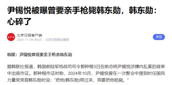 惊天秘闻被突然曝出,“亲手枪毙”震动法庭,大势已去的尹锡悦,面如死灰! 曾担任韩国陆军特战司令官的郭种根当庭“自爆”,表示自己“本不想说”,然而尹锡悦提到了韩东勋等政客的名字,命令他抓捕这些人并带到尹锡悦面前,由后者“亲手枪毙”。 尹锡悦在庭上极力撇清责任。他辩称那场会面只是私人聚餐,自己还亲自下厨招待,总统府官邸的餐厅绝不可能成为讨论叛乱的场所。他甚至以反问语气向郭种根施压,试图将严肃的密谋定性为饭桌上的闲聊。 尹锡悦的否认彻底点燃了郭种根的情绪。这位前特战司令当场情绪激动地反驳,他明确表示自己本不愿公开内部机密,但尹锡悦的抵赖让他不得不道出真相。 郭种根披露,尹锡悦在聚会中清晰点出时任国民力量党党首韩东勋及其他政客姓名,要求将这些人逮捕后带到自己面前,由他“亲手枪毙”。 这句话落地的瞬间,法庭陷入短暂死寂。尹锡悦的表情出现明显凝固,短暂沉默后仅尴尬地笑了笑,草草结束了对郭种根的质询,未再进行任何反驳。 特别检察官迅速抓住这一破绽,追问言论发生的背景,郭种根补充称当时讨论的正是政权面临挑战的“紧急局势”。 外界很快梳理出郭种根反水的关键诱因。近期尹锡悦正全力推行“甩锅”策略,将包括“驱逐在野党议员出席议会”在内的争议命令,悉数推给郭种根等执行层军方人士。 同场庭审中,双方就“国会清场”命令的下达时间激烈交锋,尹锡悦一方试图用几分钟的通话时间差,将擅自行动的责任扣在郭种根头上,这种姿态彻底击碎了后者的沉默底线。 这起爆料并不是孤立事件,而是尹锡悦执政后期政治困局的集中爆发。 2024年10月的韩国政坛,尹锡悦已陷入内外交困的绝境。其施政好评率已跌至24%,创下第六共和国成立以来历届总统就职两周年的最低纪录,经济管控不力、沟通不良等指责此起彼伏。 更致命的是,第一夫人金建希收受名牌包、涉嫌干政的丑闻持续发酵,成为在野党攻击的核心靶点。 韩东勋的名字出现在“枪毙名单”中更显讽刺。这位被称为“韩国第一剑”的政客,曾追随尹锡悦二十余年,协助其查办李明博、朴槿惠等多起大案,尹锡悦上任后更破格将其提拔为法务部长官。 二人关系的破裂,正是源于韩东勋主张金建希公开道歉以挽回执政党声誉,这一举动触怒了被称为“护妻狂魔”的尹锡悦,矛盾最终在戒严风波前彻底公开化。 庭审结束后,尹锡悦的律师团队紧急发布声明,严正否认所有指控,称相关说法纯属捏造。韩东勋本人则回应表示,这是“令人震惊而又让人心碎的指控”。 国民力量党试图将言论定性为“朋友间的气话”,发言人李俊宇强调此类表述在日常争执中常见,却难以解释总统对核心亲信发出“枪毙”指令的合理性。 目前韩国检方已经成立了专门的调查组,对郭种根爆料的内容展开核实,同时也在调取尹锡悦在相关时间段的行程记录和通讯记录,试图找到更多证据。 整个韩国政坛因为这次的秘闻陷入了混乱,无论是执政党还是在野党,都在调整自己的策略,应对这场突如其来的政治风暴。而对于普通民众来说,他们更关心的是真相能否被揭开,法律能否还所有人一个公道,毕竟没有人希望自己的国家,被一个可能存在极端思想的人掌控。 尹锡悦如今的处境,可以说是他自己一手造成的。如果他在执政期间能够收敛自己的强硬作风,尊重不同的政治立场,或许就不会走到今天这一步。“亲手枪毙”的秘闻,不仅暴露了他在权力面前的傲慢,更让外界看到了他性格中危险的一面。 无论最终调查结果如何,他在民众心中的形象已经彻底崩塌,“大势已去”这四个字,成了对他当前处境最贴切的描述。而这场风波最终会如何收场,不仅影响着尹锡悦个人的命运,也将对韩国未来的政治走向产生深远的影响。