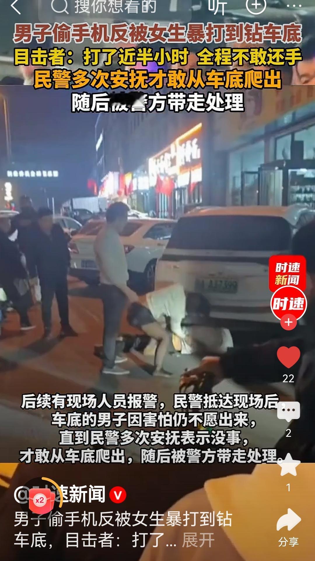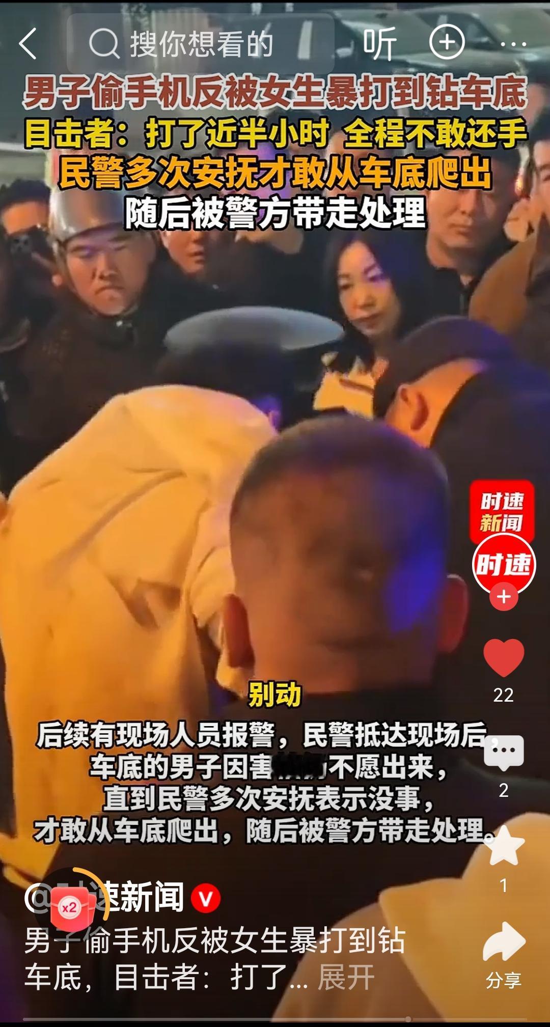 第一个被警察安慰的贼 看视频真的笑的不行[大笑] 11月6日在我们山西,一小偷偷女孩手机,没想到遇到了女汉子,被女子暴打半小时,眼镜都被打飞了。后面躲车底下不肯出来。 后面不知谁报的警,警察一直安慰他,说没事,没事,小偷才从车下钻出。 年底了,经济又不行,小偷真的不少,看到这个小偷的下场,那些贼还敢下手不[偷笑]