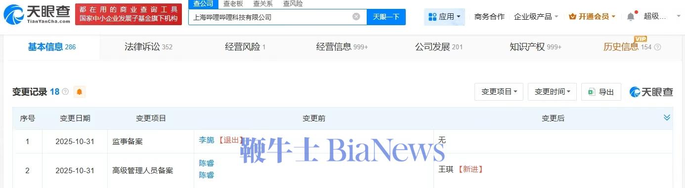 11月7日,天眼查工商信息显示,近日,上海哔哩哔哩科技有限公司发生工商变更,陈睿卸任总经理、财务负责人。