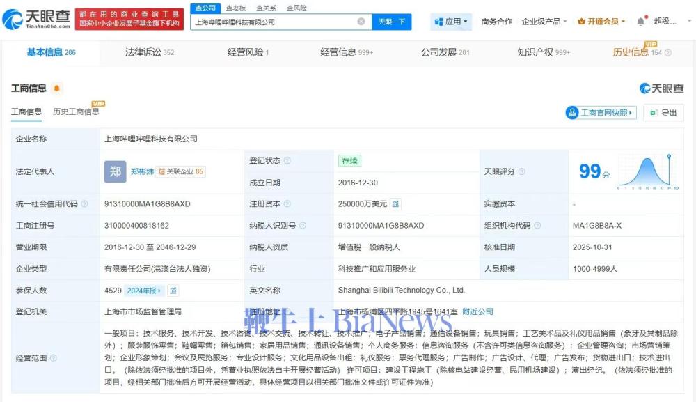 上海哔哩哔哩科技有限公司成立于2016年12月,法定代表人为郑彬炜,注册资本25亿美元,经营范围包括电子产品销售、通信设备销售、玩具销售等,由香港幻电有限公司全资持股。