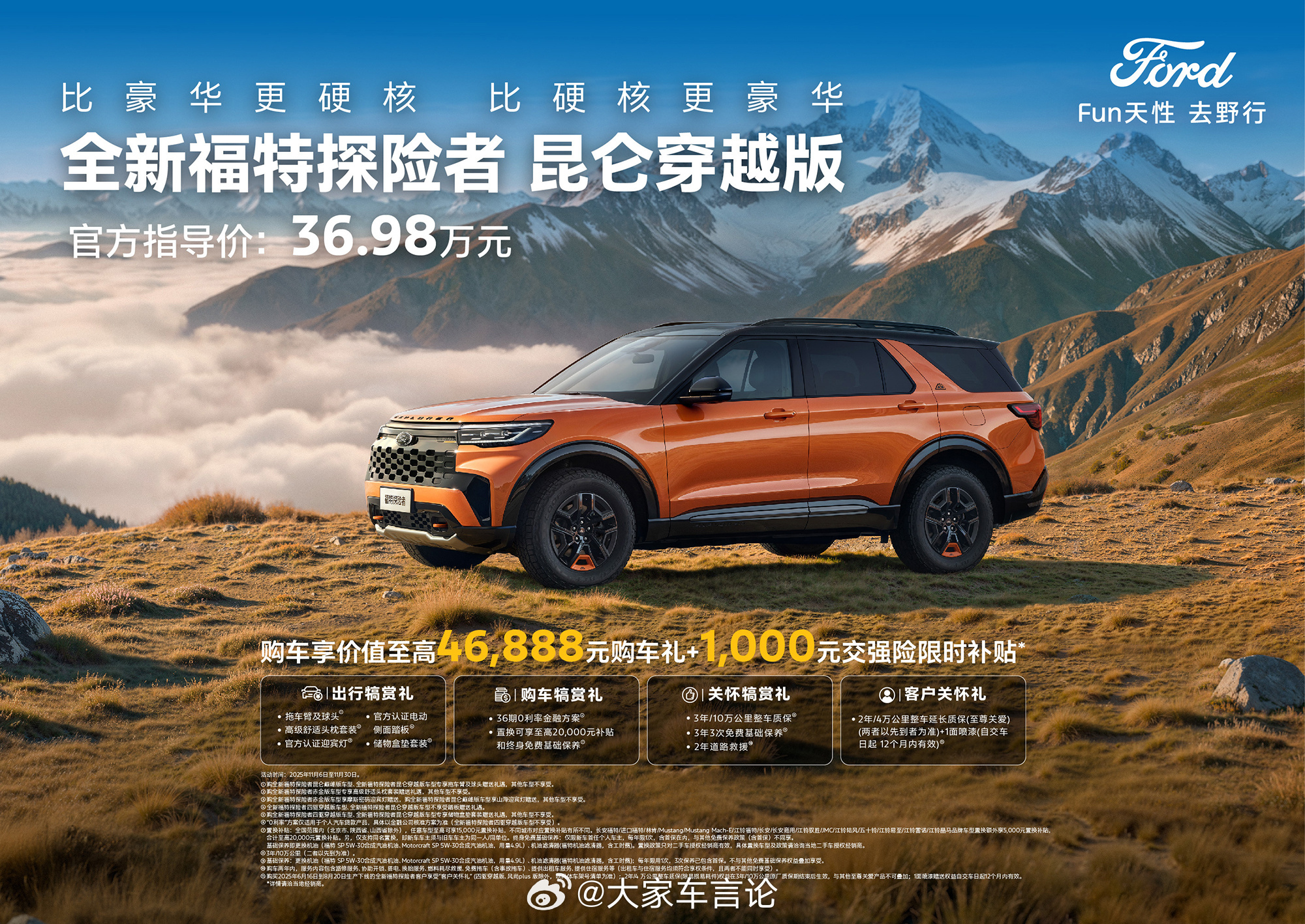全新福特探险者昆仑穿越版上市,售价36.98万元。