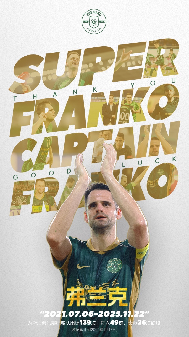 弗兰克在浙江俱乐部绿城队的时光即将落幕,但他在浙里写下的故事,将成为浙江足球永恒的财富。SuperFranko,CaptainFranko,谢谢你。