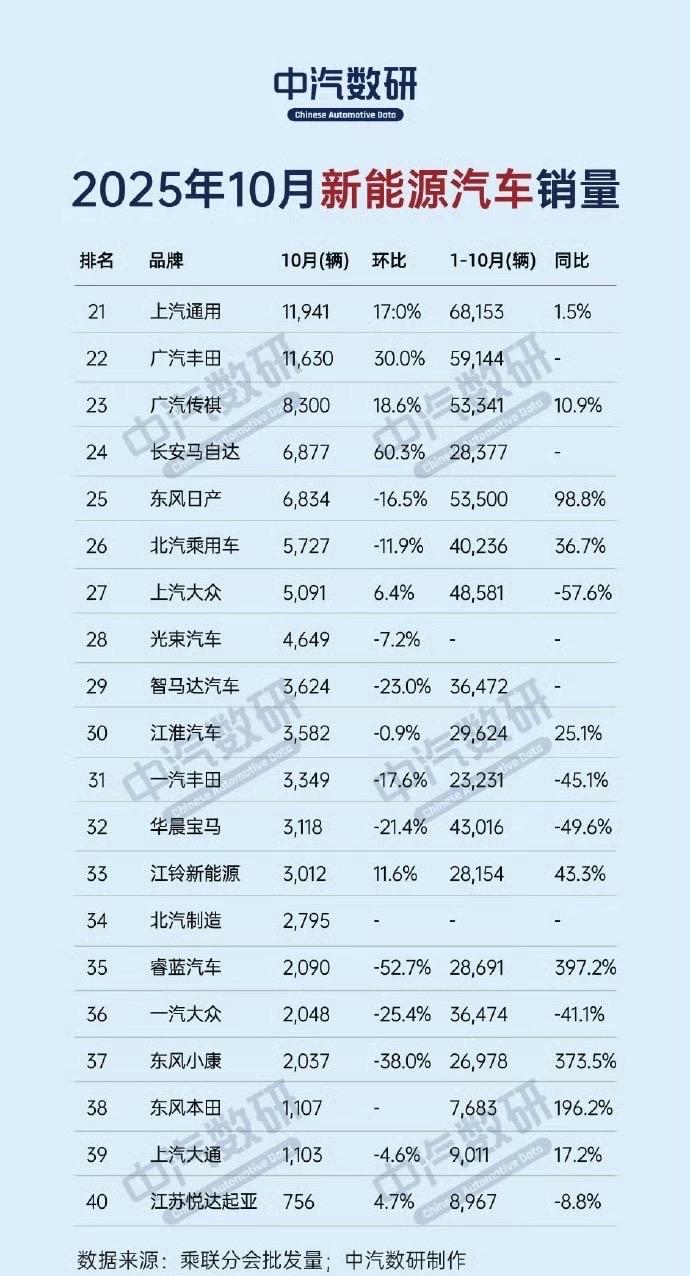 来自中汽数研整理的10月新能源汽车销量排行榜 1、比亚迪销量436856辆(1-10月3655718辆) 2、吉利销量177882辆(1-10月1345705辆) 3、五菱销量115688辆(1-10月715742辆) 4、长安销量106697辆(1-10月768258辆) 5、奇瑞销量104588辆(1-10月649266辆) 排在前5的依旧是老牌车企,零跑可以说是新势力领头羊,排在第6名,特斯拉1-10月总销量667861辆能排在第5名,还是厉害啊。