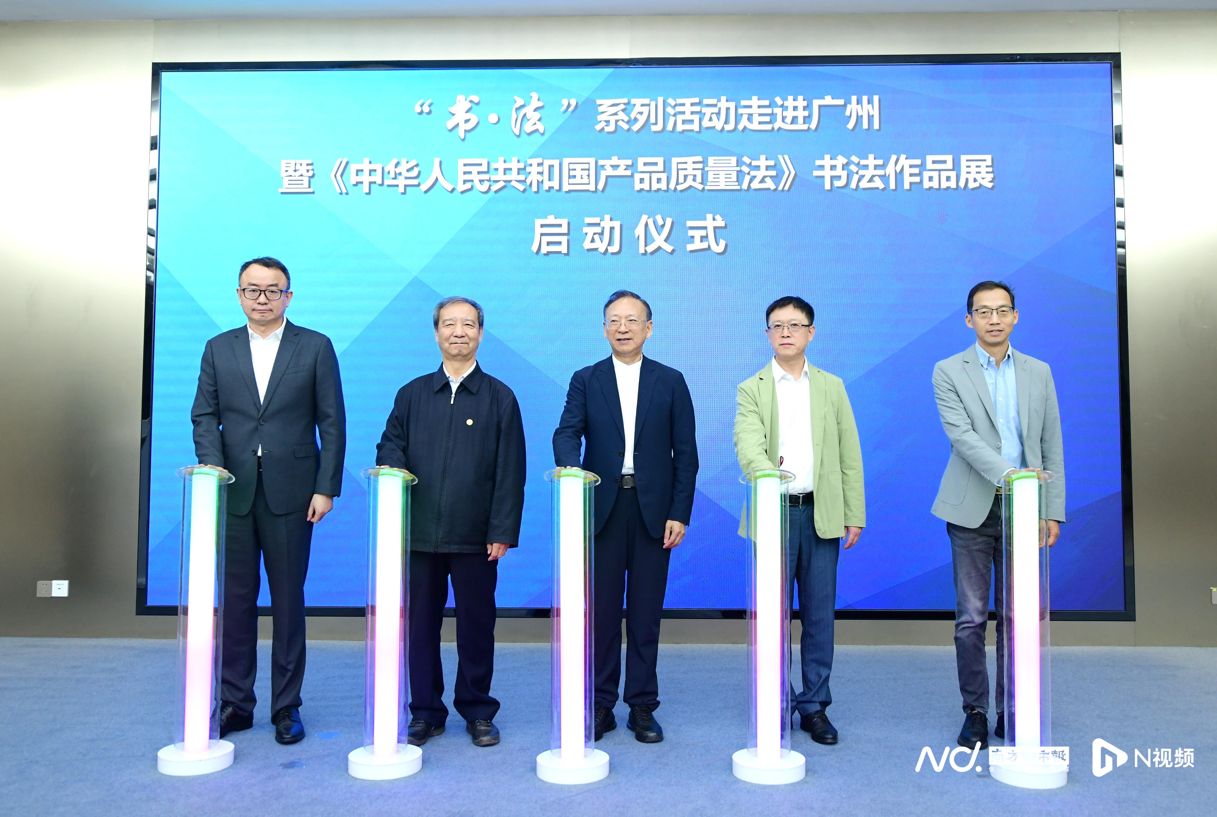 第十三届全国人大宪法和法律委员会副主任委员、中国社会工作联合会副会长江必新、中央纪委驻司法部纪检组原组长、中国书法家协会第五、六届理事、中国监狱工作协会会长韩亨林、法治日报社党委委员、副总编辑万学忠等人共同启动“‘书·法’系列活动走进广州暨《中华人民共和国产品质量法》书法作品展。