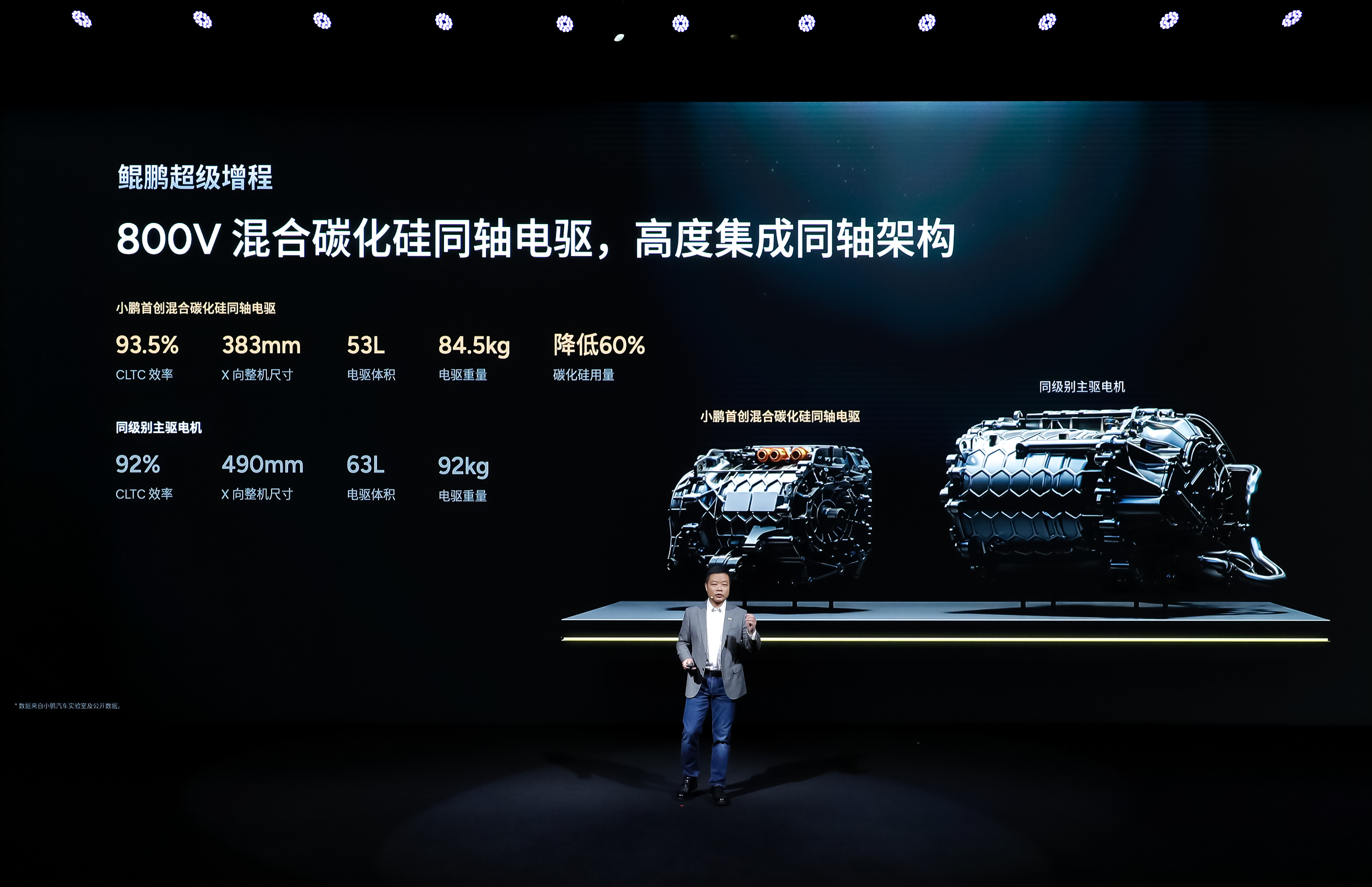 还有小鹏首创的800V混合碳化硅同轴电驱,高度集成同轴架构超厉害,CLTC综合效率达93.5%,扭矩大、功率强,电量剩8%动力都不衰减。
