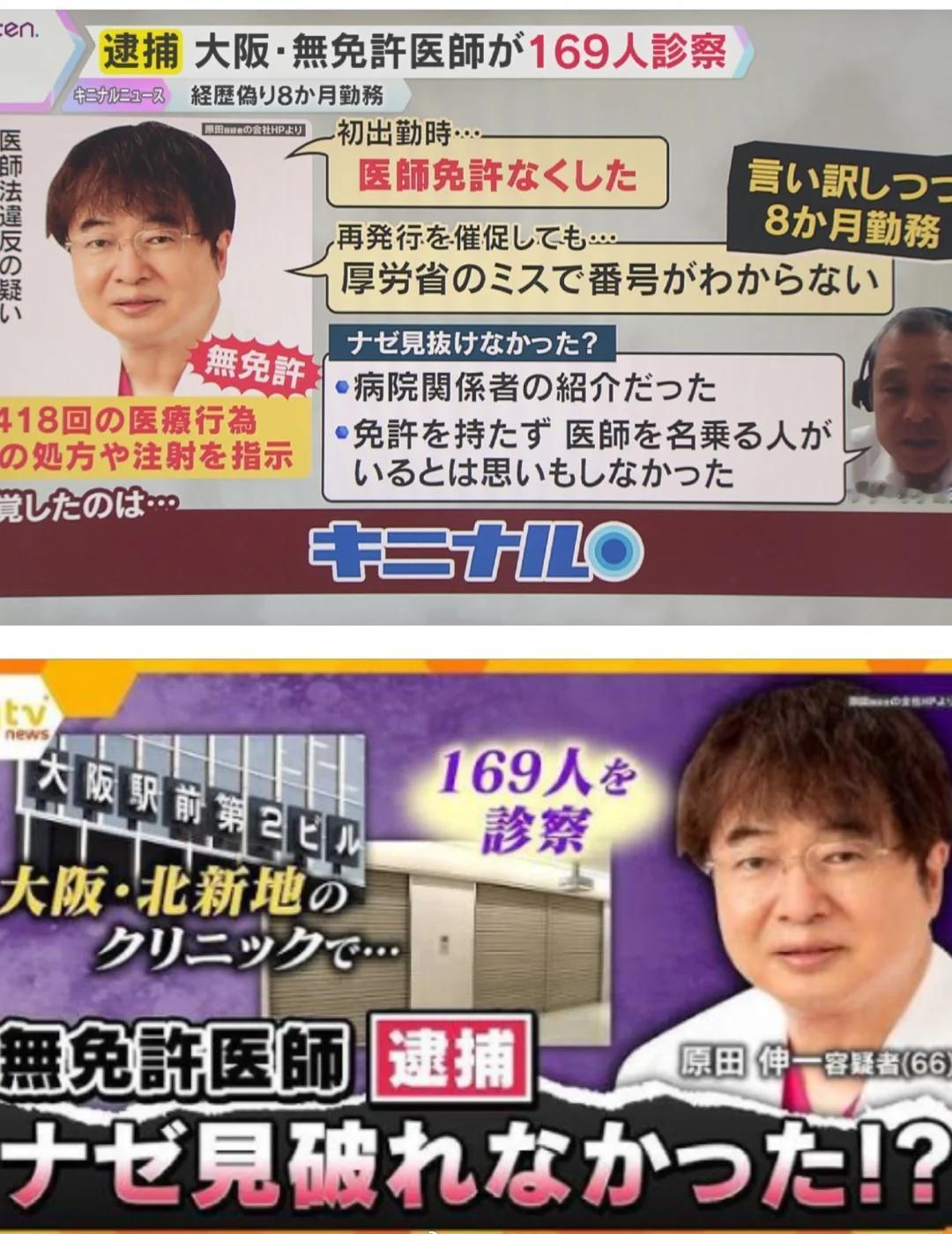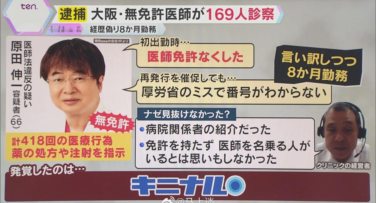 医生仙人?日本大阪一假医生混进诊所工作,行医8个月为169人看病开药竟无一人发现! 直到他被抓后,诊所同事说:“他太自然、太专业了,我们完全没怀疑过…”诊所负责人也一脸懵:“他是同行介绍来的,谁会想到是假医生?” 近日,日本大阪北新地一诊所中66岁的“原田医生”因没有医师执照行医被捕,在他参加诊所工作的8个月里,一共为169名患者看诊、开药、打针,共计418次行医行为。 曾经也有人质疑他为什么没有行医资格证,面对质疑他说:“执照弄丢了,厚劳省编号查不到…”就这样“解释着”,他工作了整整8个月。 据悉,他此前用伪造的医师许可证行医多年,直到警方从别案中意外发现他的假证图像,这才找到了他。