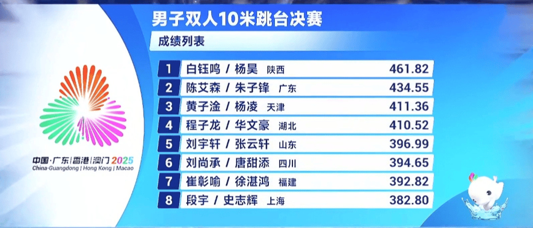 虎扑11月07日讯刚刚结束的全运会跳水男子双人十米台决赛,陕西队的白钰铭/杨昊一路领先,以6跳总分461.86分,获得金牌。