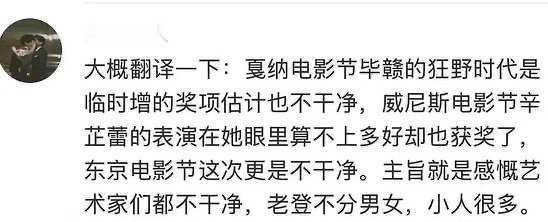 疑似郝蕾发的朋友圈,这回是真敢说啊! 她直接开喷最近电影节奖项“没含金量”,不遮不掩直指毕赣导演奖项是“假的”,还暗讽女演员凭“扯头发片段拿威尼斯影后”是运作的结果,另外还说了最近东京电影节白百何等女性名不见经传,这波操作够抓马! 作为国际电影节常客,郝蕾的底气确实足——戛纳、威尼斯都进过,她这话一出,内娱圈又炸锅了。辛芷蕾倒是挺理智,回应说奖属于团队,评价表演得看全貌,还希望大家因争议去了解电影,这格局确实不一样。 不过话说回来,内娱要是真能“运作”欧洲三大奖,还轮得到2025年的辛芷蕾?早些年大花们早就撕得昏天黑地了。郝蕾的直爽虽然解气,但娱乐圈的乱象,光靠嘴炮可解决不了。大家团结点,少点套路,多点真诚,不好吗?