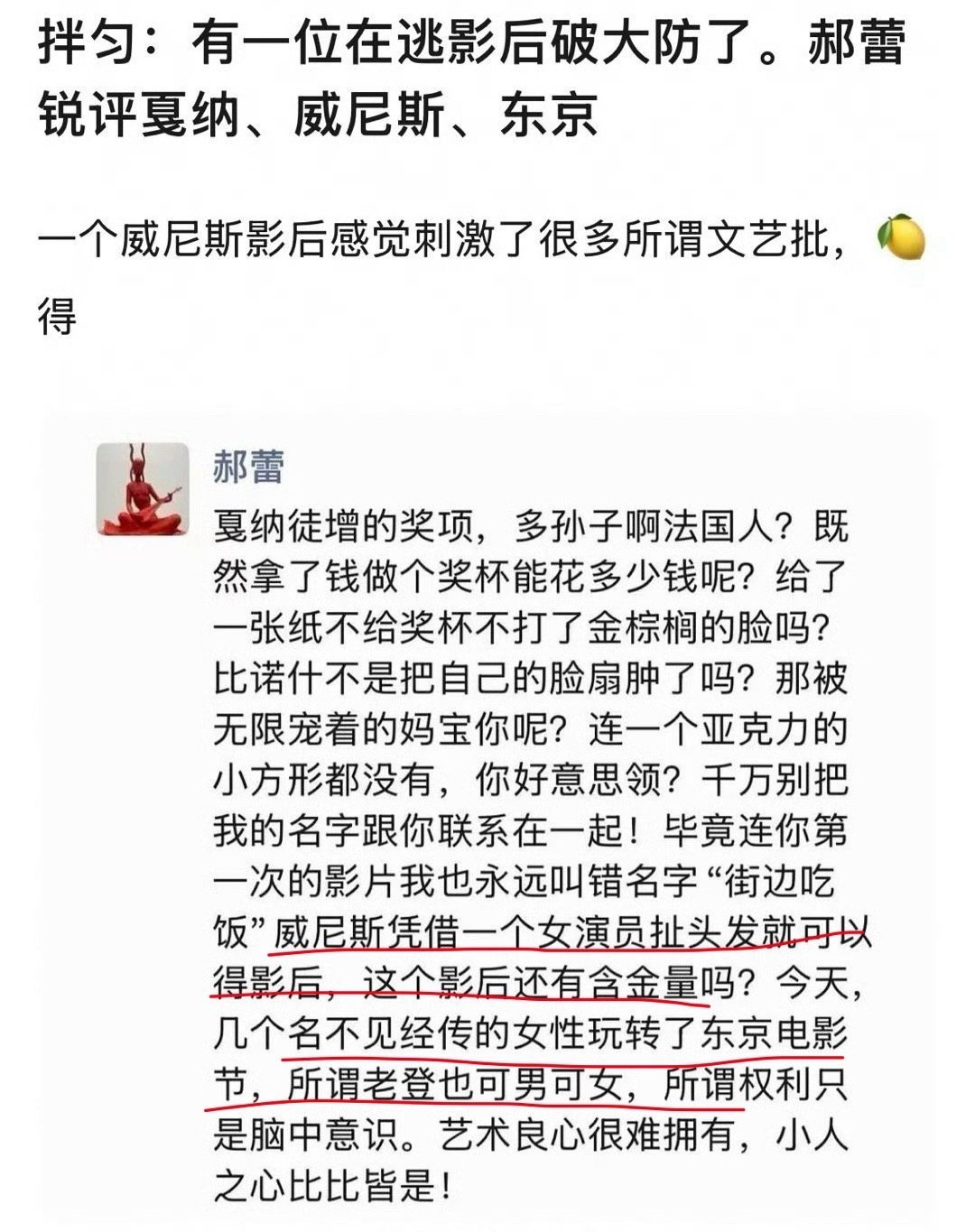 蕾子还是急了,把不知奖项运作这段删掉就是一篇完美公关文。本来只嘲郝蕾,现在双嘲了。