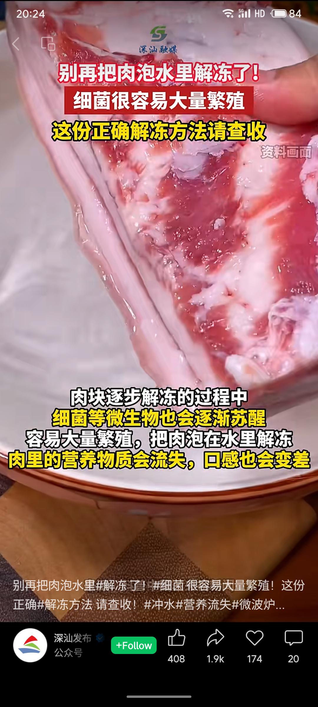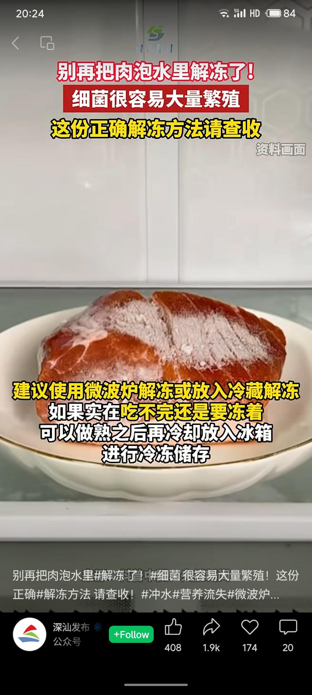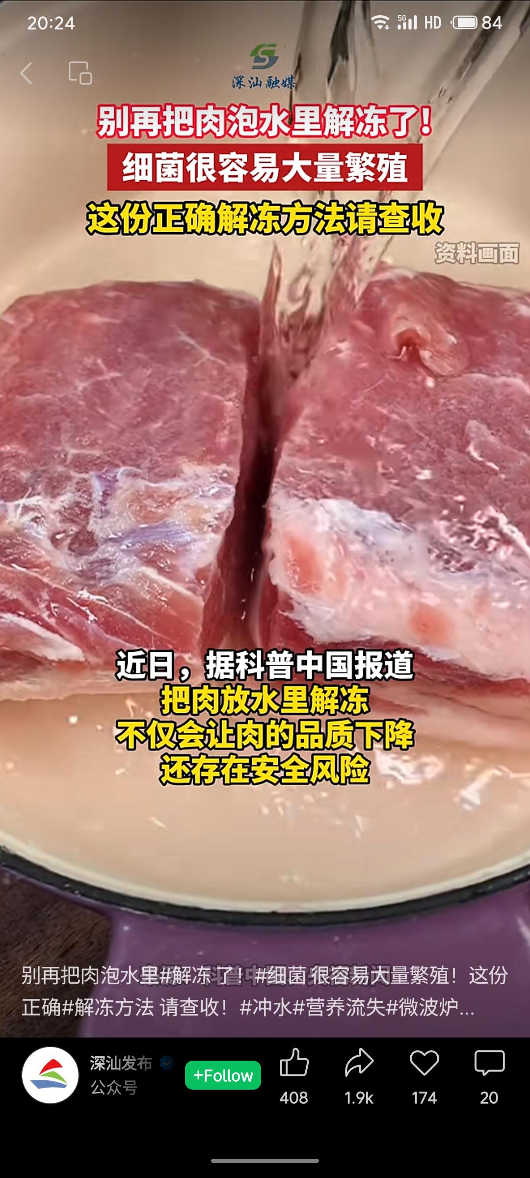 将肉类泡水解冻存在安全风险,易致细菌大量繁殖,且会导致营养流失和口感变差。建议采