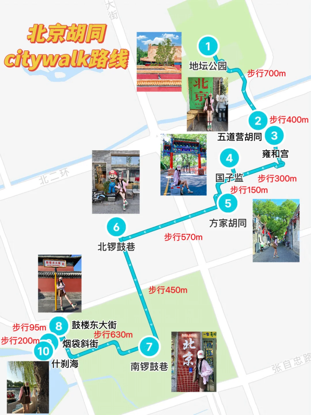 地坛公园➠五道营胡同➠雍和宫➠国子监➠方家胡同➠北锣鼓巷➠南锣鼓巷➠鼓楼东大街➠烟袋斜街➠什刹海