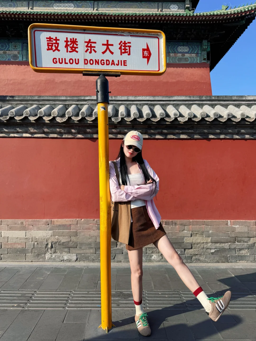 红墙鼓楼为背景 打卡复古的东/西大街路牌 北京中轴线