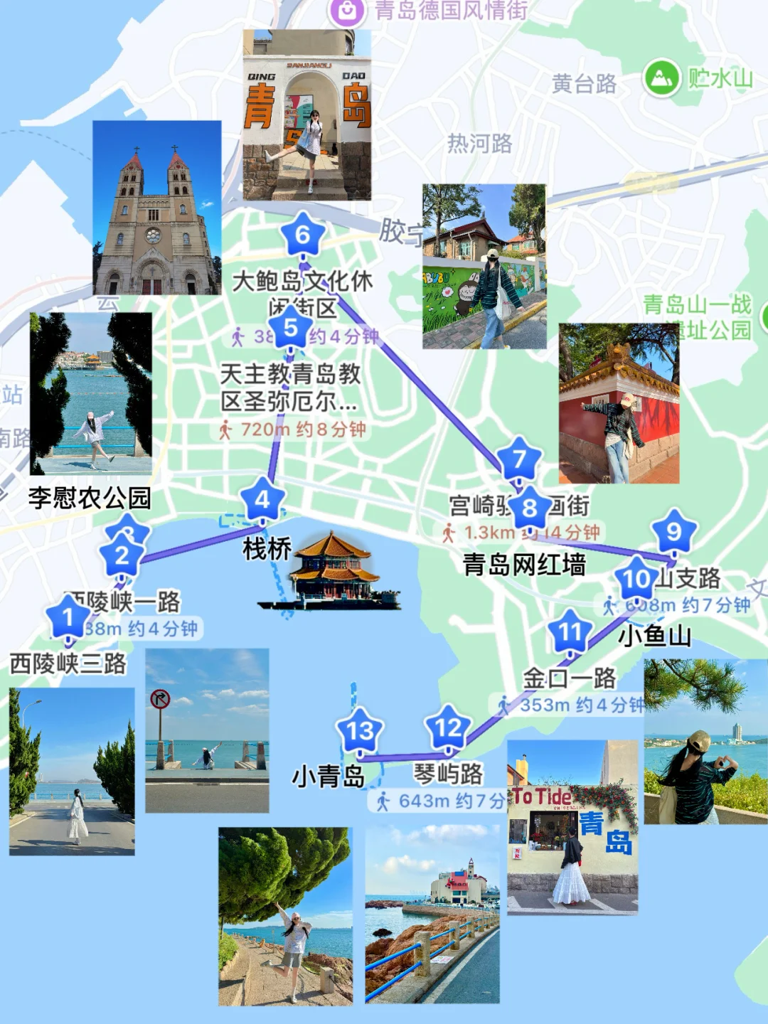 西陵峡三路➠西陵峡一路➠李慰农公园➠栈桥➠圣弥厄尔教堂➠大鲍岛➠龙江路➠青岛网红墙➠福山支路➠小鱼山➠金口一路➠琴屿路➠小青岛