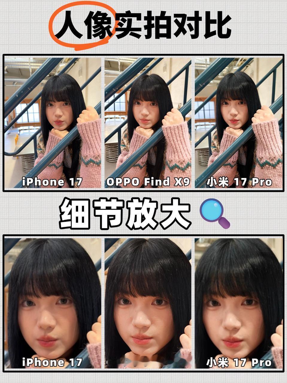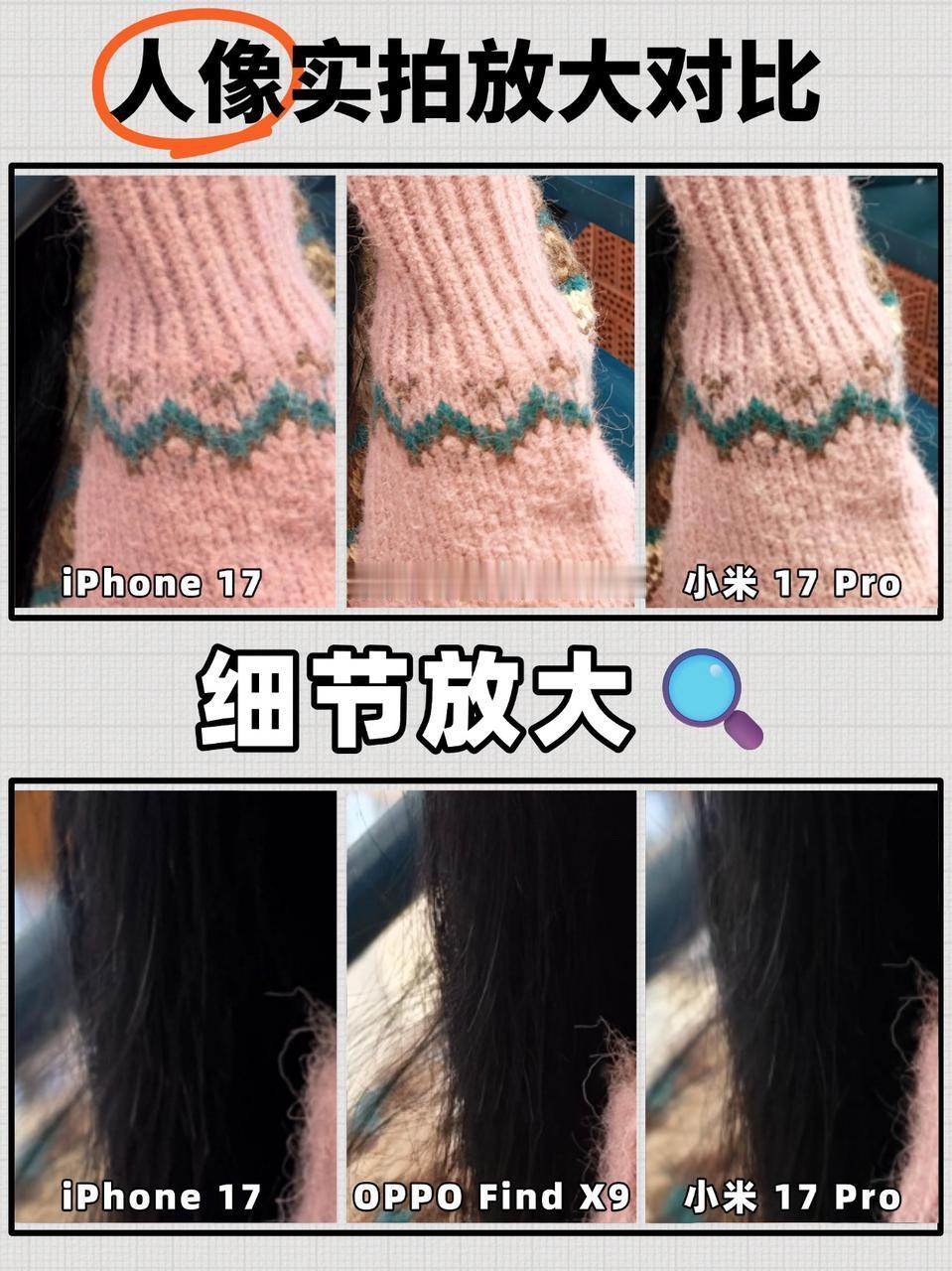 都说旗舰拍照都差不多,但实际对比后会发现差距真的蛮明显的,就拿拍人来说,OPPO Find X9、iPhone 17、小米 17 Pro这三大热门旗舰各有各的成片风格,但要说哪个最会拍,我这一票投给OPPO Find X9,至于为什么下面这组样张会告诉你。 不放大看好像没什么区别,模特拍的都挺OK的,但放大后差距一下就来了,其中OPPO Find X9不仅五官立体细节丰富,面部光影呈现也很到位,此外得益丹霞原彩镜头加持,气血感也得到了真实的还原,而非一眼假的美白,这点很加分。 接下来重点来了,像袖子处边缘的毛线、头发丝这些小细节处理上,OPPO Find X9也是其中最清晰的存在,完全不会糊和发虚,该有的细节都拍的一清二楚,讲真应该没有人能拒绝OPPO Find X9这拍照表现,满分十分的话,你愿意给它打几分呢?OPPOFindX9 iPhone17 小米17Pro 旅拍 数码大玩家 一起聊数码 苹果安卓 国产手机 三大热门旗舰