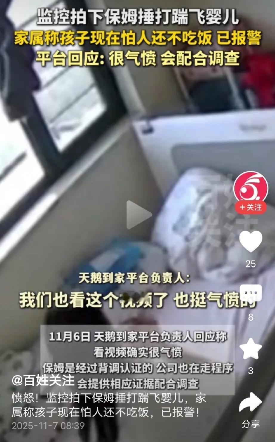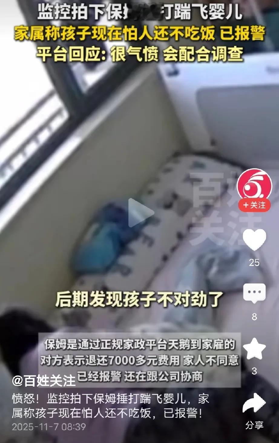 黑龙江哈尔滨,男子通过某平台雇佣50多岁的保姆来带他不满一岁的孙子,一段时间后,男子发现,孩子精神紧张、不爱吃饭,他带孩子去医院检查后,发现孩子身体一切正常,男子觉得蹊跷,偷偷查看监控,发现保姆多次用拳头捶打孩子,甚至一脚把他踹飞到床角,男子气愤不已,赶紧联系平台,可平台的说法让他不满,男子最终报警处理。 韩先生的孙子不满一岁,他儿子儿媳要上班,他和老伴也有工作,孙子没人带。 一家子商量好后,决定雇个保姆,挑来选去,最终在某知名平台下单雇佣了一名50多岁的保姆,费用是一个月7000元。 平台跟韩先生一家承诺,这个保姆,他们是做过检查的,她既没有犯罪记录、征信也很好,在入职前也给她去医院体检了,请韩先生放心。 韩先生一家在得到平台的承诺后,10月初就放心地让保姆来上班了。 这位保姆是一名50多岁的大姐,看起来为人也老实勤快,在韩先生一家面前,对孩子也是有耐心和爱心,因此他们对她更是很放心。 起初,保姆带孩子,孩子一切正常,也没看出宝宝有什么一样。 但,最近这几日,韩先生发现他的孙子精神紧张,很容易受到惊吓,也不爱吃饭,他问保姆,孙子有没有什么异常。 保姆淡定地回答他说,孩子一切正常,还说可能最近天气变化无常,孩子食欲才会受到影响。 韩先生一家不放心,还是带孩子去医院看了医生,医生经过一番检查,也没发现孩子有任何疾病,他们考虑可能孩子是受到别了刺激。 医生说了孩子身体没有疾病,那他为什么精神这么紧张,这么容易爱哭闹,韩先生觉得很奇怪。 于是,在11月5日这天,韩先生偷偷调出了保姆平时带孩子的监控,这一看简直把他气得不轻。 韩先生看到,有很多次,保姆用拳头用力地捶宝宝,有时捶他身上,有时捶他脸上,还有一次宝宝哭闹,她竟然一脚直接踹飞宝宝。 宝宝被踹到床的一脚,大声无助地哭闹着,保姆不仅不安抚,起身又一把把宝宝抓过来。 韩先生看着这些视频,既气愤又心疼,一个不到一岁的孩子,他手无缚鸡之力,这个保姆怎么忍心? 50多岁,快当奶奶的年纪,应该是有耐心有爱心的,可她的行为简直就像一个恶魔。 韩先生赶紧联系了平台,把视频录像也发给平台。 平台负责人看了录像后,也显得很气愤,他们说,这个保姆的行为涉嫌犯罪,决不包庇她,会配合韩先生一家报警。 平台还说,在保姆入职前他们也做过了调查,并未发现她有犯罪记录,最后平台表示愿意退回7000块钱。 但是,韩先生一家表示,他们在乎的不是钱,而是要给保姆受到相应的惩罚,还宝宝一个公道。 现在宝宝一看到人就哭闹,显得很害怕,食欲我不好,保姆的所作所为给宝宝造成了很大的心里上海。 目前,韩先生一家已经报警处理,平台也支持他们的做法,承诺会配合警方开展调查。 《刑法》第260条之一规定,对未成年人、老年人、患病的人、残疾人等负有监护、看护职责的人虐待被监护、看护的人,情节恶劣的,处三年以下有期徒刑或者拘役。 本案中,保姆对不满一岁的婴儿实施暴力殴打,已涉嫌构成虐待被监护、看护人罪。 从监控视频来看,保姆多次用拳头捶打婴儿,甚至一脚将其踹飞至床角,这些行为已构成情节恶劣的虐待行为,应依法追究其刑事责任。 同时,《治安管理处罚法》第43条规定,殴打他人的,或者故意伤害他人身体的,处五日以上十日以下拘留,并处二百元以上五百元以下罚款。 情节较轻的,处五日以下拘留或者五百元以下罚款。 本案中,保姆的暴力行为已构成对婴儿的身体伤害,应依法给予治安处罚。同时,若婴儿经鉴定构成轻伤以上伤害,保姆还可能构成故意伤害罪,面临更严厉的刑事处罚。 《民法典》第1198条规定,宾馆、商场、银行、车站、机场、体育场馆、娱乐场所等经营场所、公共场所的经营者、管理者或者群众性活动的组织者,未尽到安全保障义务,造成他人损害的,应当承担侵权责任。 本案中,家政平台作为保姆的提供者,若未尽到合理的审查和管理义务,可能需要承担相应的民事赔偿责任。 平台虽然声称对保姆进行了背景调查,但未能有效发现其暴力倾向,这表明其审查机制存在漏洞,应当对婴儿的损害承担相应的赔偿责任。 看完这事儿,真的又气又心疼!一个不到一岁的宝宝,连反抗的力气都没有,却被本该细心照料他的保姆多次拳打脚踹,想想监控里的画面就揪心。 更让人无语的是,家政平台拿着“背景调查”当挡箭牌,可连保姆的暴力倾向都查不出来,出事后只想着退钱了事,完全无视宝宝受到的身心创伤。 这种“走过场”的审核、敷衍的处理态度,根本配不上家长的信任和高额服务费。 必须严惩施暴保姆,也得让平台负起该担的责任,不然还有多少家庭敢放心找保姆?孩子的安全容不得半点马虎,这不仅是个案,更是对整个家政行业的警示! 对此,大家怎么看?欢迎留言讨论。@猫眼学法