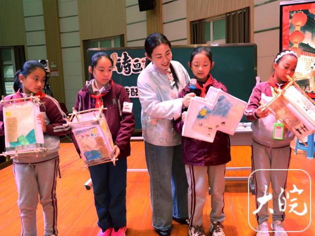来自阜阳市颍上县第四小学的美术教师张玮崴率先带来了她的特色课程——《诗画灯彩》。灯彩艺术历史悠久,诗画结合更是中华传统文化的独特韵味,张老师通过趣味互动让学生感受到了传统艺术的魅力。台下的听课教师们不时点头称赞,有的还忍不住拿出纸笔记录教学细节,课后纷纷围拢交流:“这种把传统艺术和实践操作结合的方式,特别符合小学生的认知特点,回去我们也要试试!”