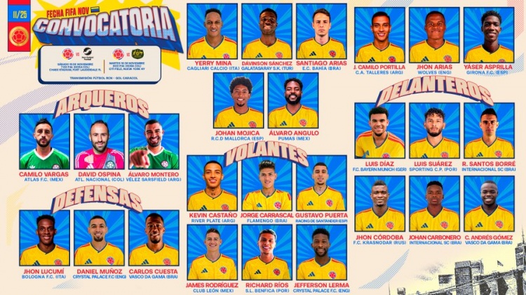 直播吧11月7日讯哥伦比亚公布最新一期国家队大名单,J罗、路易斯-迪亚斯、穆尼奥斯、奥斯皮纳在列。